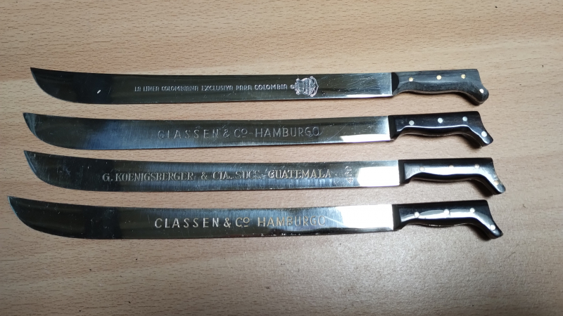 4 Stk. Miniatur-Macheten, vermutlich als Brieföffner vorgesehen. Meiner Meinung stammen sie aus den 1940-50er Jahren.