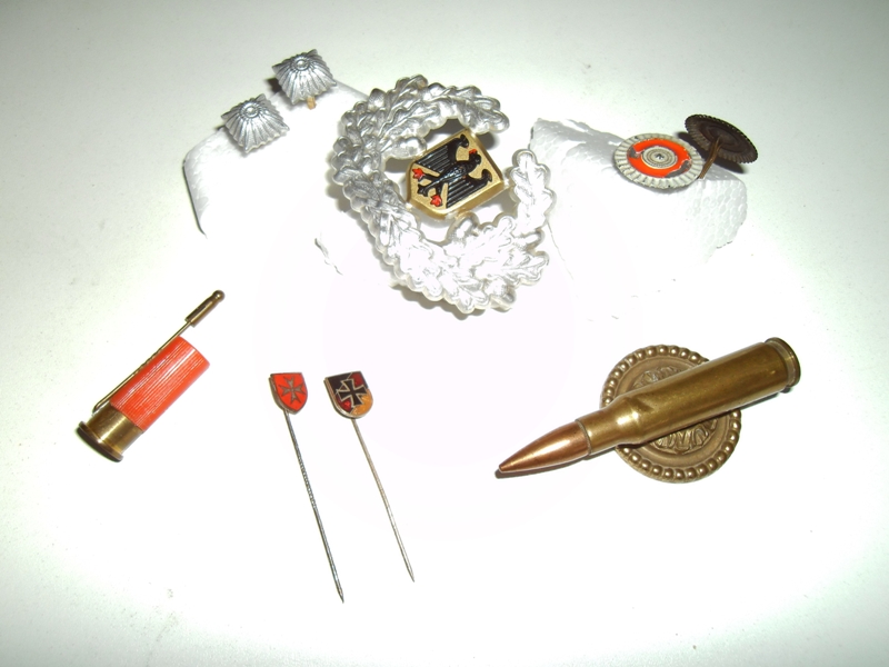 1 BW-Barettabzeichen silber mit Adler (1 Stecker fehlt), 2 BW-Dienstgrad "Stern" für Schulterklappe, silber, 2 Kokaden Deutsches Reich, 1 Anstecknadel Reservistenverband schwarz, rot, gold, mit Eisernem Kreuz, 1 Anstecknadel Malteser Kreuz 1 Anstecker Patrone und 1 Patrone RA 89 auf Messingzier.