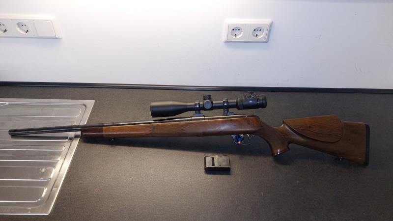 Krico Jagdmatch Repetierbüchse in .308 mit Deutschem Stecher. Lauflänge 58 cm. Schaftlänge 36,5 cm. Montiert mittels Festmontage ist ein Zeiss Conquest DL 3-12x50 mit Leuchtpunkt (Absehen 60). Gebrauchter Zustand (Druckstellen im Schaft). Abnehmbare Riemenbügel. 3+1 Magazin. Abholung möglich. Weitere Fotos folgen. Versandkosten werden nach Kauf genau ermittelt.