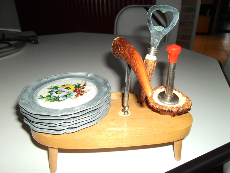 Ständer mit 6 Untersetzern für Gläser (Rückseite 3 Stück mit Zeichen der Volksbanken Raiffeisenbanken und 3 Stück Engelchen mit Trompete). Ein Flaschenverschluss, ein Flaschenöffner und ein Korkenzieher mit Hirschhorn..
