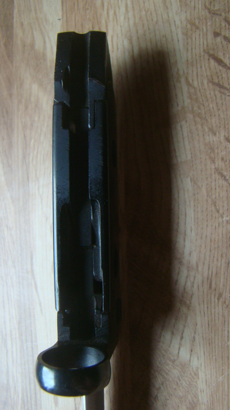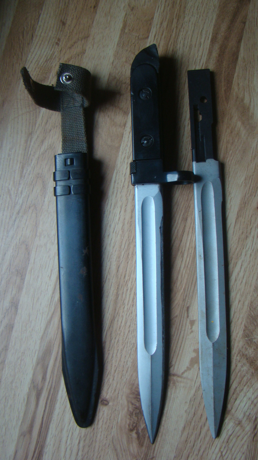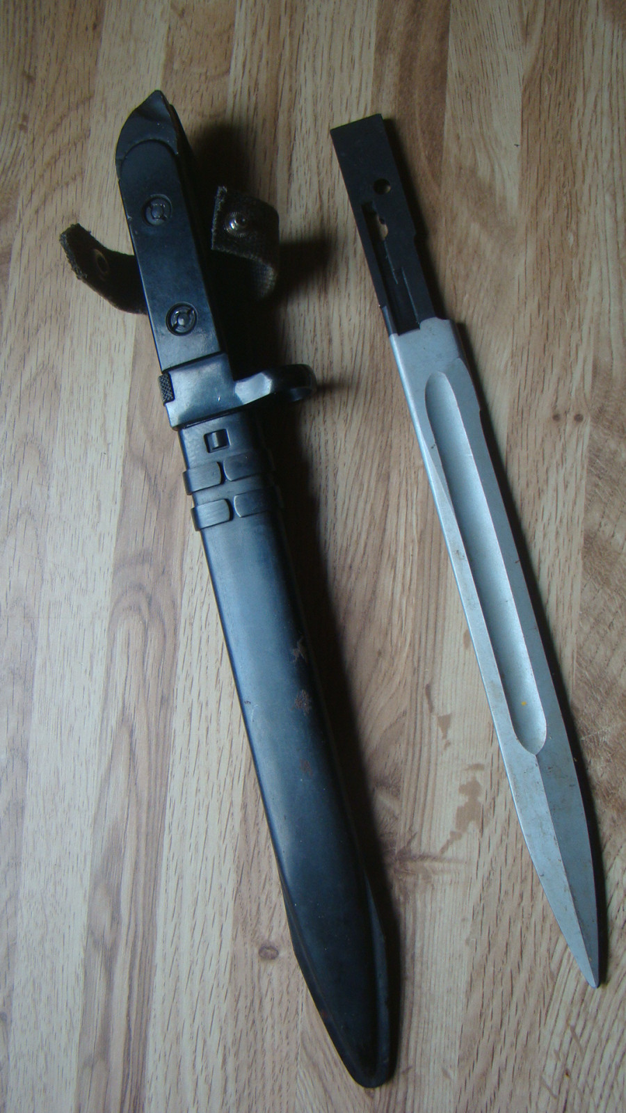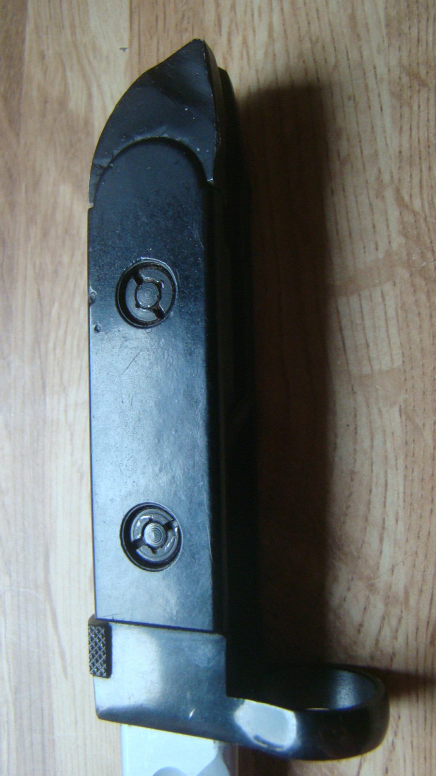 Bajonett wohl für zivile Nutzung abgeändert: Saubere jedoch geschärfte Klinge, mit 2. ungeschärfter Ersatzklinge, Gewheraufschubbacken entfernt, nicht mehr auf Gewehr aufpflanzbar - warum auch immer ?!?