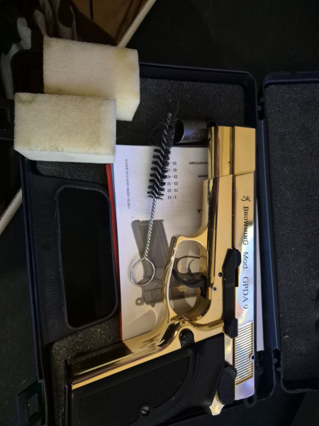 Browning GPDA 9 Schreckschusspistole Gold - Diese Ausführung der Gaspistole Browning GPDA 9 präsentiert sich mit einer eleganten Oberfläche in gold. Auch diese Version hat wieder ein 9 Schuss Magazin für Knallpatronen, Platzpatronen und Reizstoffmunition im Kaliber 9 mm P.A.K.. Die Pistole wird von der Firma UMAREX in Arnsberg hergestellt. Die schwarzen Griffschalen stehen im eleganten Kontrast zum goldenen Finish dieser Schreckschusswaffe. Ein Muss für Sammler und Liebhaber außergewöhnlicher Schreckschuss und Gaspistolen.