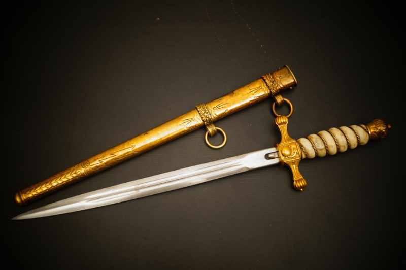 Fundzustand. Bronzeteile, teils mit Schutzlack erhalten. Klinge aus Stahl, beidseitige doppelte Kehlung. Kein Hersteller. Marine Nummer in der Klinge. Griff ohne Schäden.