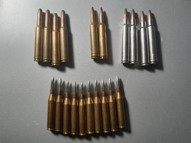 Lose Patronen. 10 x 5,6 mm Super Express von Hofe, 4 x 300 Wetherby Magnum, 4 x 338 Winchester Magnum, 2 x 7 mm Remington Magnum.