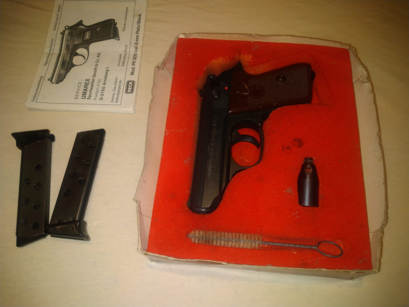 Schreckschusspistole Perfecta Mod. Pk800 EL-Alamein (PTB196) im original Karton mit, zwei originalen Magazinen, Reinigungsbürste, Abschussbecher und Gebrauchsanleitung.
