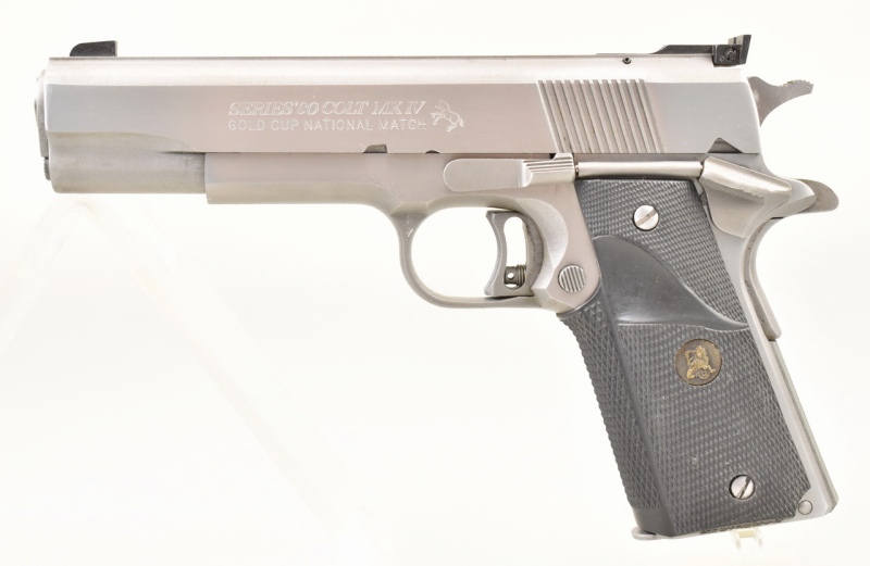 Gebrauchte Stainless - Steel Pistole Modell 1911 MK IV der Serie ´80 " Gold Cup National Match " des bekannten amerikanischen Herstellers COLT. Spiegelblanker Lauf. Kölner Beschuß 1988. Kettner Vertriebsstempel. Höhen- und seitenverstellbare " Elliason " Visierung. Balkenkorn. 167mm langer Visierlinie. Abzug mit Triggerstop. Pachmayr Signature Gummigriffschale mit Fischhautmuster.