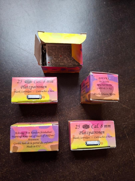 Biete hier 5 Päckchen a 25 Patronen, mit original Beipackzettel, die guten alten WADIE 8 mm K Platzpatronen an. Verkauf erfolgt ohne Garantie, Gewährleistung und Umtausch da Privatverkauf. Ich versende mit Waren Sendung zu 3,50 €, wenn anders gewünscht bitte angeben. Päckchenpreis pro, entspricht 16 € pro Packung.