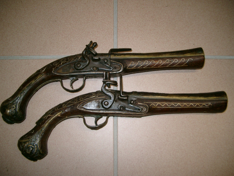 Verkaufe zwei alte Steinschlosspistolen. Bei einer ist der Schaft beschädigt. Länge je ca. 40cm - recht schwer.