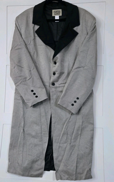 verkaufe aus dem Nachlass eines Westernhobbyisten: einen FRONTIER CLASSICS Frock Coat (US Import) in Größe XL (Maße: Schulterbreite ca. 52 cm, einfache Breite über die Brust unterhalb der Achseln ca. 58 cm, Gesamtlänge ca. 112 cm), ist mit US Größe 46 angegeben - soweit ich weis, gab es diesen Mantel nie offiziell in Deutschland zu kaufen - hellgrau, schwarzer Kragen, Mischgewebe - wenig getragen mit ein ganz leichten Tragespuren (siehe Fotos), sehr guter unbeschädigter Zustand