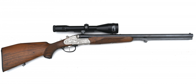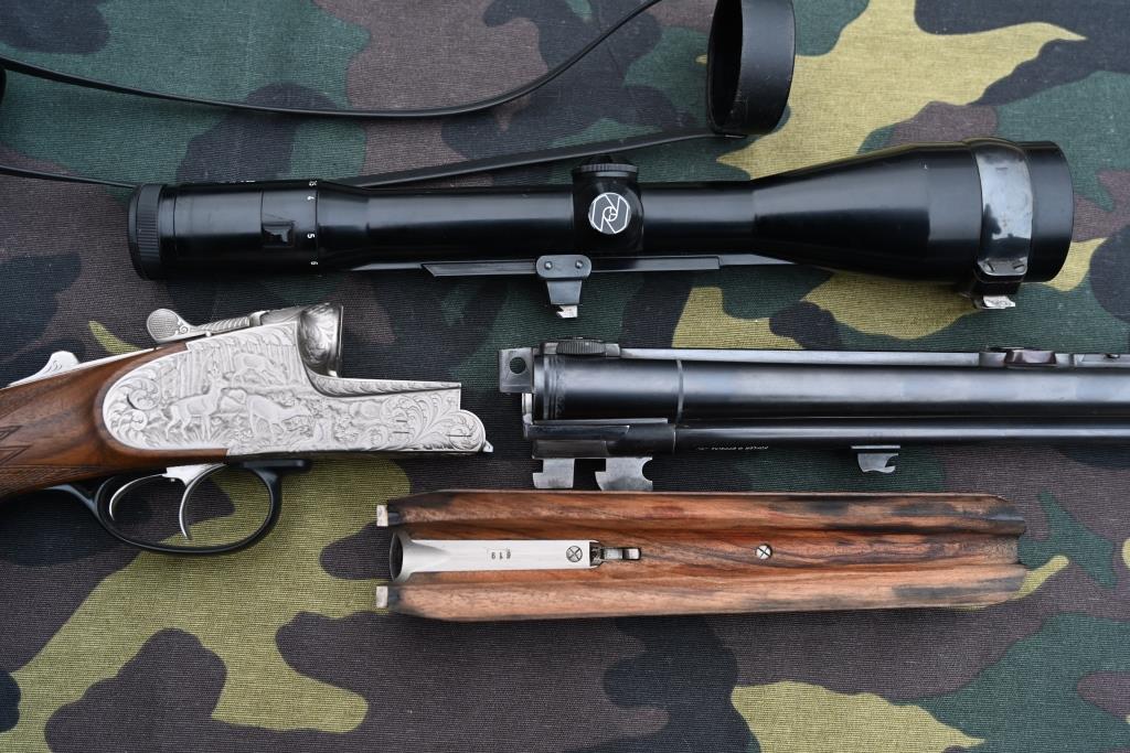 Jagdgewehr, Drilling, Kombinationswaffe, Dreiläufer mit Handspannung für den Kugellauf, herausnehmbaren Seitenschlössern, einstellbarem Rückstecher, Auszieher, Umschaltung links oben auf dem Kolbenhals und Ölschaft.
