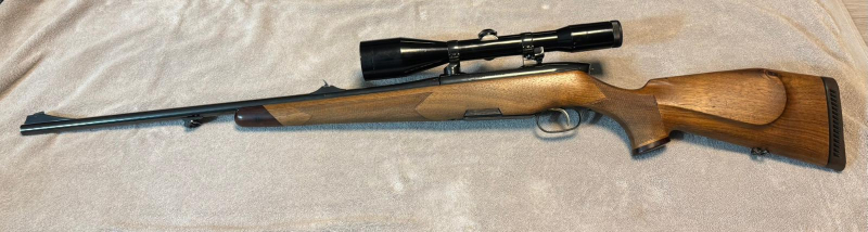 Verkaufe meine Repetierbüchse Steyr Mannlicher Luxus im Kaliber 7x64. Montiert ist ein Zeiss Diavari-ZA 2,5-10x52 mit Absehen 8 (entspricht Absehen 4 mit verstärktem oberen Balken). Das Glas ist mit einer Original Steyr-Schwenkmontage montiert. Das Modell Luxus hat, im Gegensatz zum Standardmodell, ein Stahlmagazin, welches unkaputtbar ist. Das Gewehr hat besseres Schaftholz und Sonnenschliff auf der Kammer. Die Waffe ist leicht und führig und verfügt über einen französischen Rückstecher, der auch ohne Stecher gut schiessbar ist. Die Schussleistung ist mit RWS TIG und Barnes TTSX 140gr. besser wie 30mm.