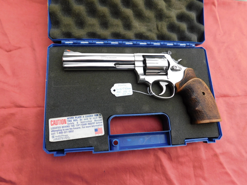 S&W Modell 686-5 Kal. 357 Magnum, 6 Zoll Lauf, Lauf innen spiegelblank und Profil scharf. Gefutete Trommel, Timing und Abzug perfekt. Gültiger Beschuss vorhanden. Es ist keine Magnumrille vorhanden. Waffe hat meiner Meinung nach minimale Gebrauchsspuren, Matchgriff aus Holz vermutlich Nill.