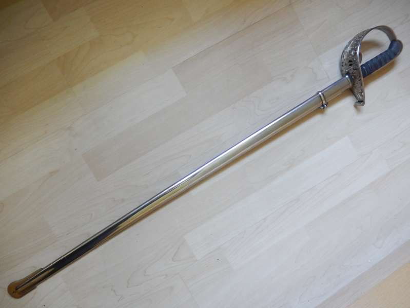 .Schweizer Ordonanz Degen 1899, Größe II ( GED mittel) Klingenlänge 810 mm, Klingenbreite 24 mm, Gesamtlänge mit Scheide (vernickelt) 980 mm, der Griffbügel endet in das Stichblatt und bildet einen durchbrochenen gearbeiteten Korb, Dekor: Schweizer Wappen umrahmt von Rankenwerk, Griff mit Fischhaut bespannt und Kupfer-Silberdrahtwicklung, Fingerschlaufe ist vorhanden, Einführungsjahr Armee 1899, dieser Degen ist von 1901, gefertigt von Waffenfabrik Neuhausen Schweiz, Waffen -Nr. 1109 Gr. II, der Zustand ist ohne Makel (beinahe Neuwertig). Dieses Angebot ist privater, nicht gewerblicher Natur. Der Verkauf erfolgt unter Ausschluss jeder Gewährleistung und Rücknahme
