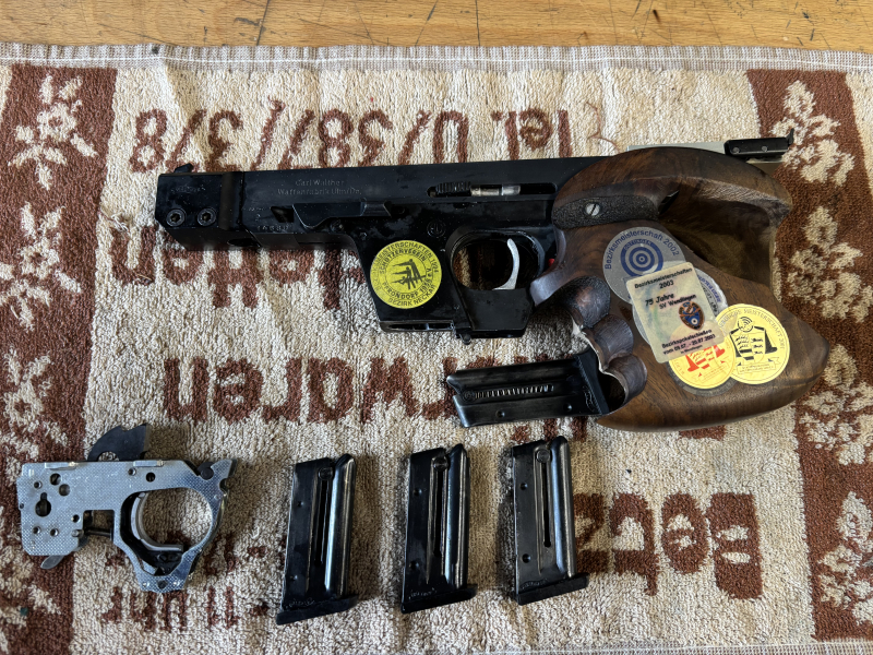 Sehr guterhaltene olympische Schnellfeuerpistole von Walther OSP im Kal. 22k, mit nagelneuem Ersatzabzug u. -4- Magazinen. Munition RWS R25 kann seperat dazu erworben werden, ist nicht Bestandteil dieser Auktion.