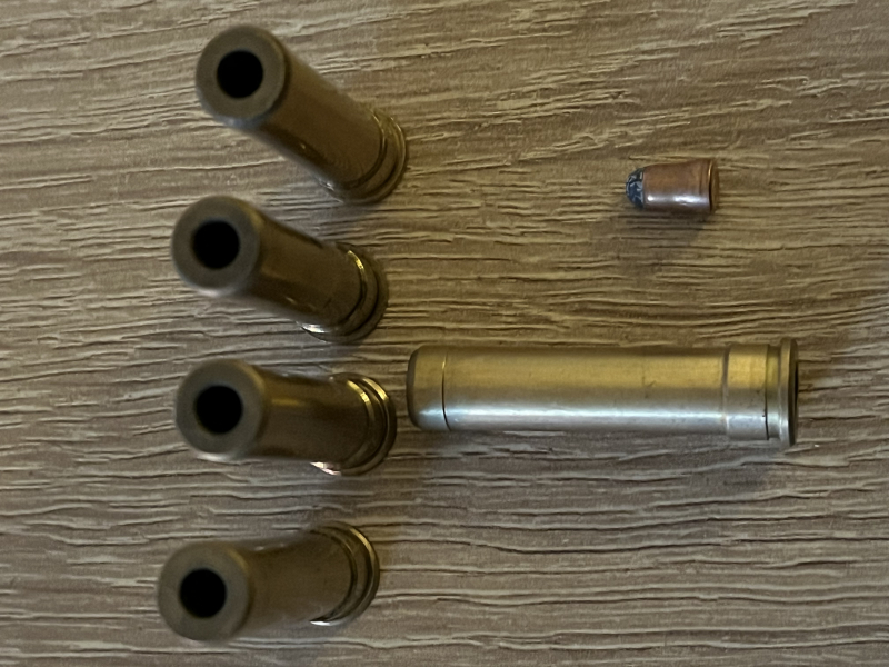 Biete 5 Ladehülsen , Patronen , für 357 Magnum Revolver an . Damit kann man M20 4mm Patronen verschießen , siehe Beispielfotos . Ob sie auch für 38 Spezial passen kann Ich nicht sagen . Für kostengünstiges trainieren . Patronen müssen nicht , bei vorhandener Waffe , in die WBK eingetragen werden . Kostenloser Versand . Privatverkauf daher keine Garantie oder Rücknahme