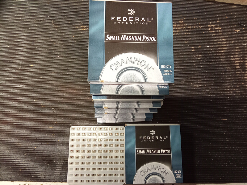 Gebe das Wiederladen auf und verkaufe deshalb 8 St 100er Päckchen Federal Zünder Smal Piston Magnum no 200. 3 St. hab ich beim Verpacken verdaddelt. Deshalb nur noch 797Stück, die natürlich immer trocken gelagert wurden. Privatverkauf und deshalb kein Umtausch oder Rücknahme oder Garantie.