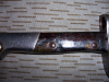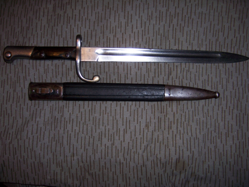 Bajonett für das Gewehr 1908 Mauser. Das Gewehr im Kaliber 7x 57mm wurde von den Firmen DWM und Mauser vor dem 1. Weltkrieg für den Export nach Brasilien produziert. Die Länge incl. Scheide beträt circa 45cm. Das Bajonett selbst hat altersbedingt schon bessere Tage erlebt: Beidseitig am Griff etwas pockennarbig und mit parziell kleineren Ausbrüchen an den Nußbaumholzgriffschalen um die Vernietung, siehe Bilder. Das Bajonett wurde hergestellt von der Firma Simson & Co aus Suhl und trägt die frühe Fertigungsnummer 2953, der Drücker ist leichtgängig. Die Scheide mit Stahlblechbeschlägen stammt aus brasilianischer Fertigung, erkannbar an dem FI-Stempel auf dem Tragehaken. Dies deutet auf eine Ersatzscheide hin und würde den guten Zustand der Scheide erklären. Der Versand erfolgt nur innerhalb von Deutschland aus versichertes Paket. Privatverkauf, daher keine Garantie, Rücknahme oder Gewährleistung.