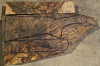 Die ersten Aufnahmen wurden auf einem feuchten Holzstück gemacht, um die Muster besser sichtbar zu machen. Das letzte Bild zeigt die Maße in Zentimetern. Die Umrisse wurden mit einem Blaser F3 gezeichnet. Die Stücke sind seit über fünf Jahren luftgetrocknet. In der Mitte befindet sich ein Riss, der durch weitere Bearbeitung entfernt werden kann.