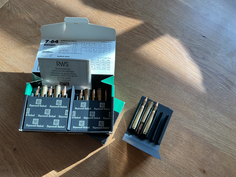 38 Patronen von RWS im Kaliber 7x64 mit dem 8g/123gr KS Geschoss in Originalverpackung.
