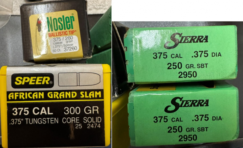 zum Verkauf stehen aus Wiederlader-Nachlass 175 Geschosse .375 zwischen 200 und 300 grain schwer. 100 x Sierra 250 grain, Art.Nr.: 2950 50 x Nosler 260 grain, Art.Nr.: 37260 25 x Speer 300 grain, Art.Nr.; 2474