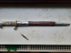 Nicht aufpflanzbare Variante, umgearbeitetes Stück aus der Zeit der Weimarer Republik, Stichblatt entfernt, Gefäß gekürzt , Klinge auf etwa 330mm gekürzt Herstellermarkierung von "E.&F. Hörster Solingen", der Truppenstempel "L.Sta.32.", die braune Lederscheide nummerngleich gestempelt,