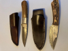 2 Stück Damast Messer, 1x echtes Horn mit Klingenlänge 10 cm und Gesamtlänge 20 cm; 1x Holzgriff mit Klingenlänge 12 cm bis zum Heft, Gesamtlänge 22 cm. Beide mit Scheide. -siehe Fotos- Verkauf im Auftrag eines Freundes.