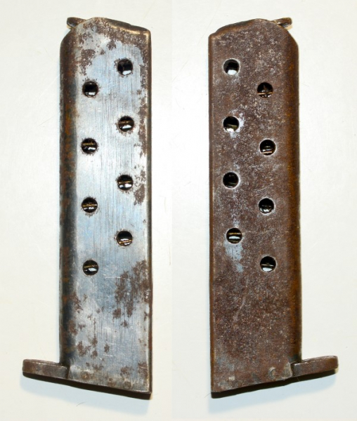 Original Magazin zur Ruby Pistole des 1. Weltkriegs, Rückenlänge 10,7 cm, die rechte Seite flugrostig
