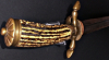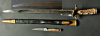 Klinge, ohne Hersteller. Lederscheide 49cm, Mund -und Ortblech, mit origin., Befestigung. Ledernaht geschlossen, in originaler Erhaltung. Gesamtl. 64cm. Klinge ca.47 x 3cm. Länge, Beimesser, " Nicker " 19cm.