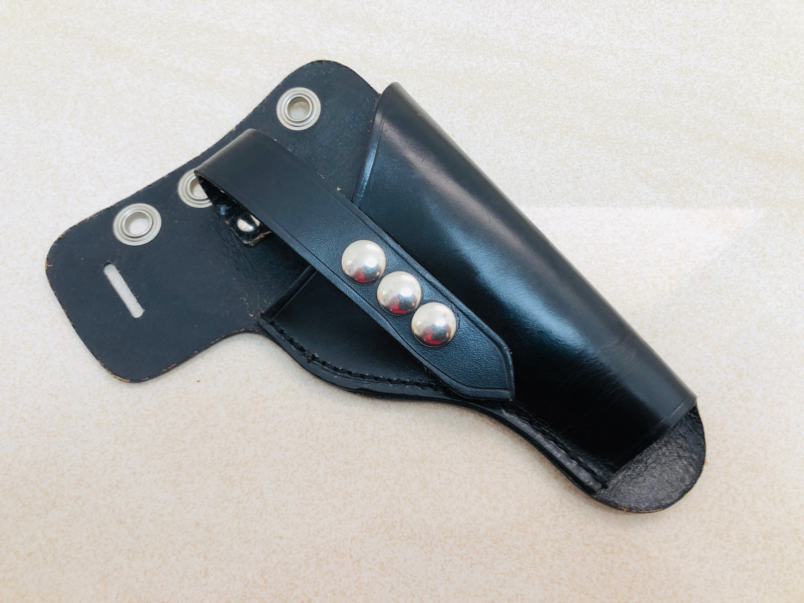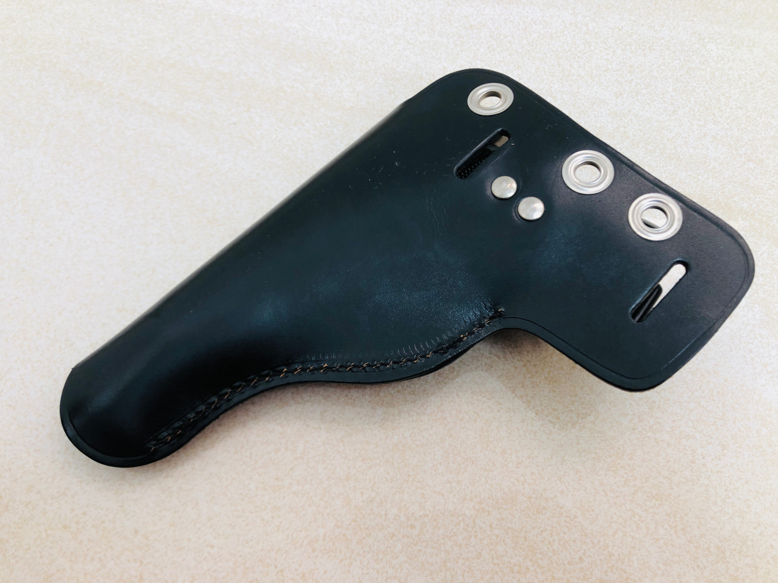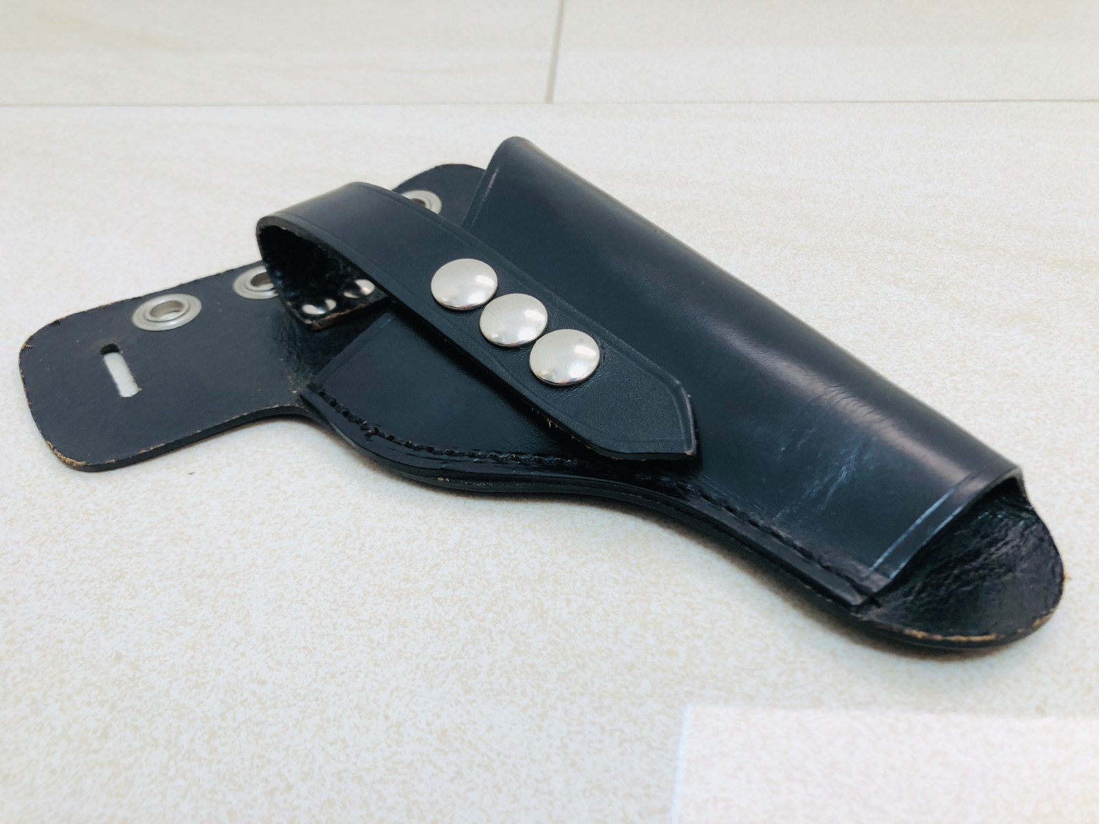 Rechtshandholster, unten offen, mit dreifachem Druckknopfverschluss, welcher an unterschiedliche Griffstücke angepasst werden kann.