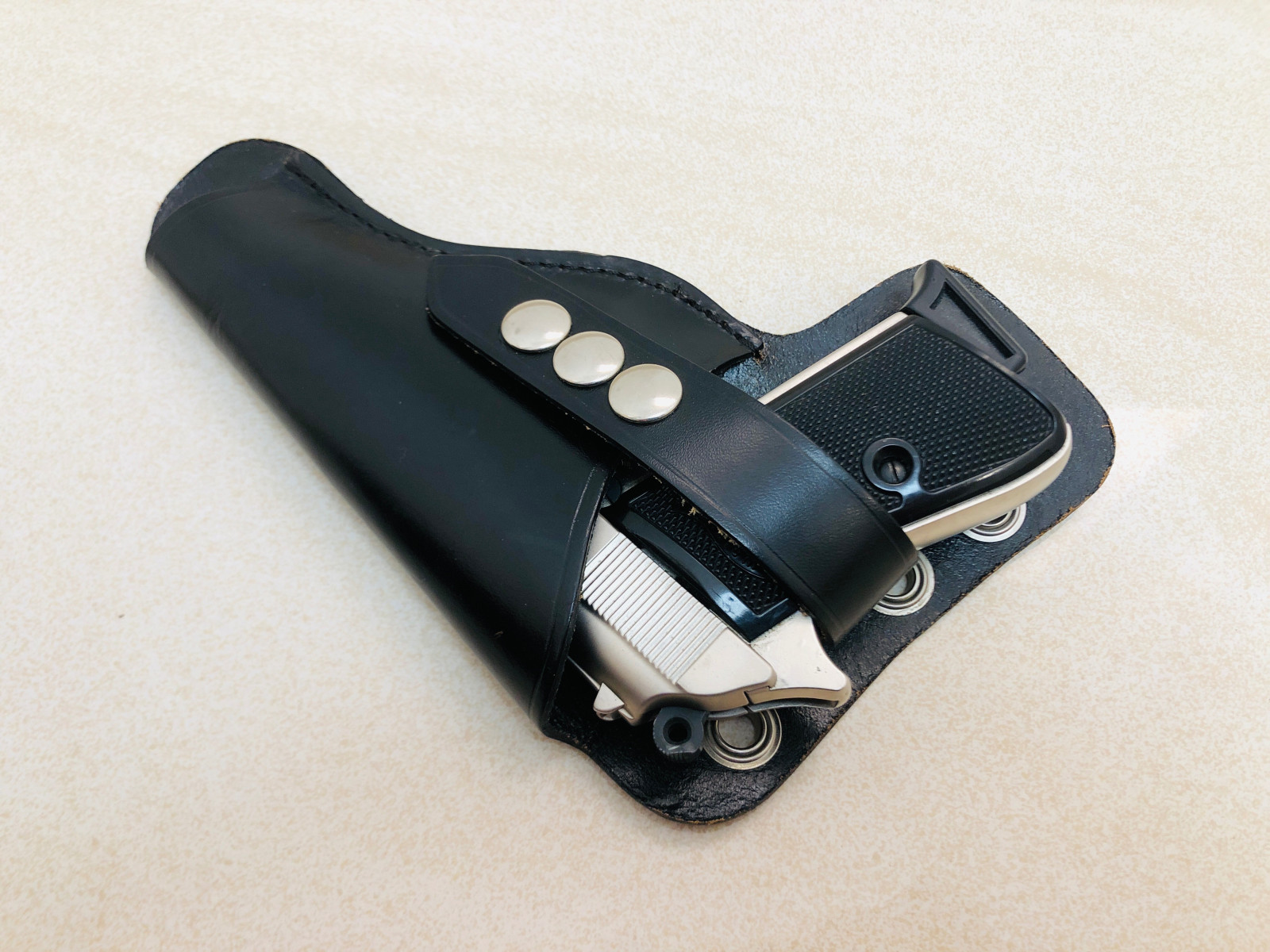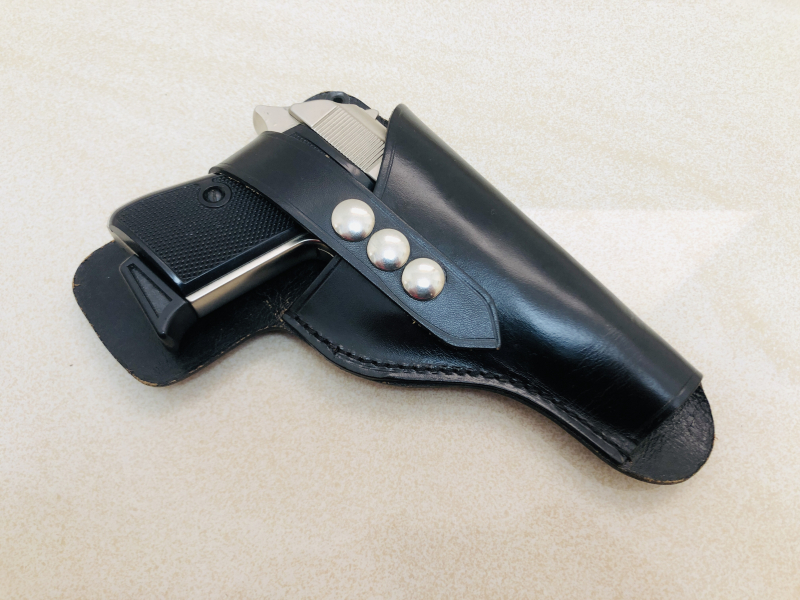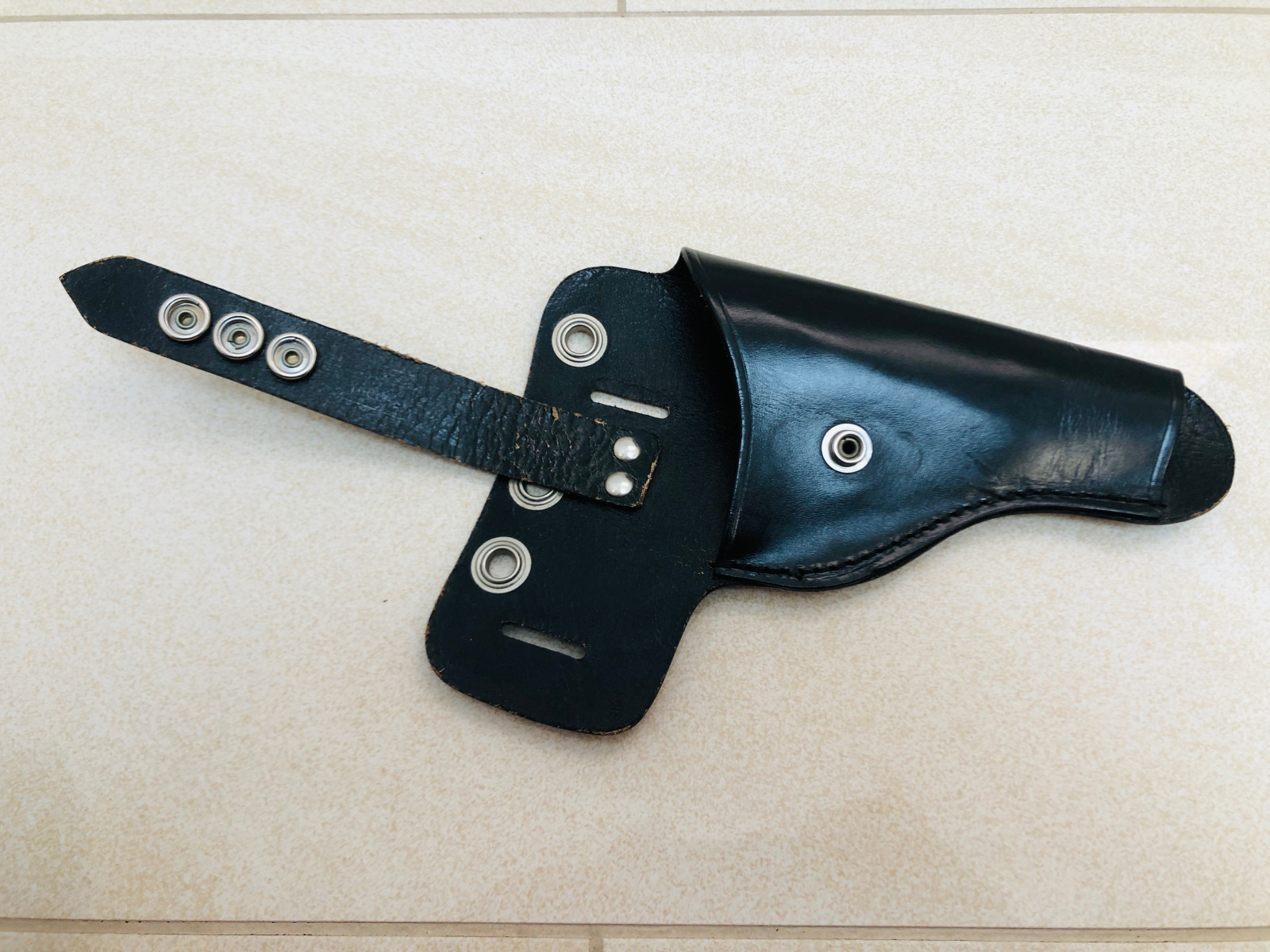 Rechtshandholster, unten offen, mit dreifachem Druckknopfverschluss, welcher an unterschiedliche Griffstücke angepasst werden kann.