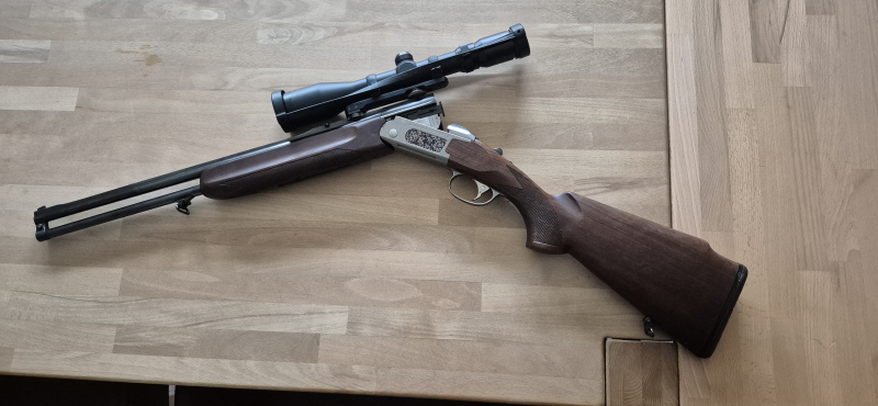 Zum Verkauf steht eine Kipplaufbüchse mit zwei Läufen im Kaliber 30-06 Spring. Die Waffe kommt aus einer Übernahme eines verstorbenen Jägerkollegen.