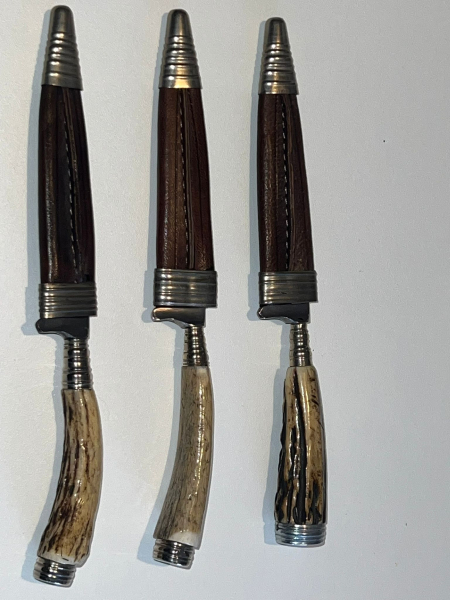 ich biete 3 sehr schöne und unbenutzte Jagdnicker in sehr gutem Zustand ( siehe Bilder ) (3er Set) Nicht benutzt, nicht geschliffen !!!! Leider ist keine Herstellerangabe darauf zu sehen. Auf einem steht nur Rostfrei. Privatverkauf, keine Garantie, Rückgabe oder Gewährleistung. Versand mit Altersprüfung. 18