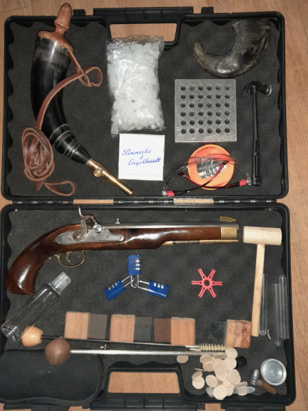Verkauf aus nachlass perkussions pistole dikar cal 45 spannen abziehen funktioniert mit koffer samt inhalt da privat keine gewehrleistung garantie oder rücknahme