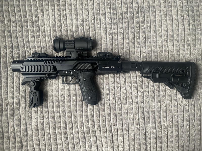 Das K.P.O.S. G2 Umbau Kit von FAB Defense verwandelt eine Standard-Pistole in ein festes Waffensystem für Sportdisziplinen mit Anschlagschaft oder für die persönliche Verteidigung (PDW Personal Defense Weapon) oder für Spezialeinsätze.