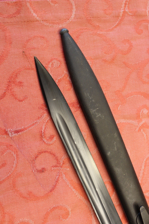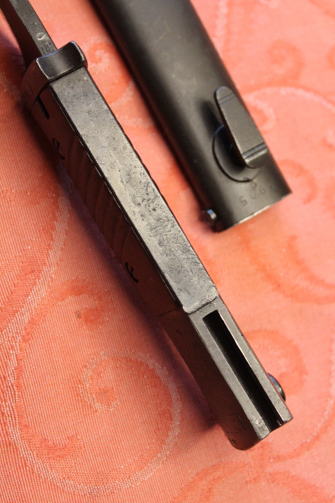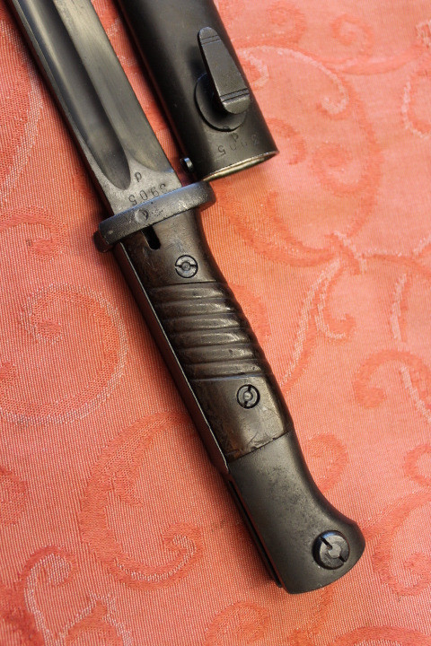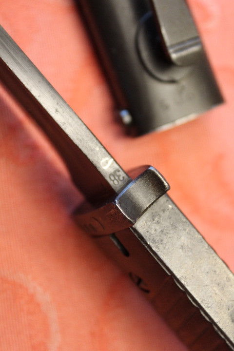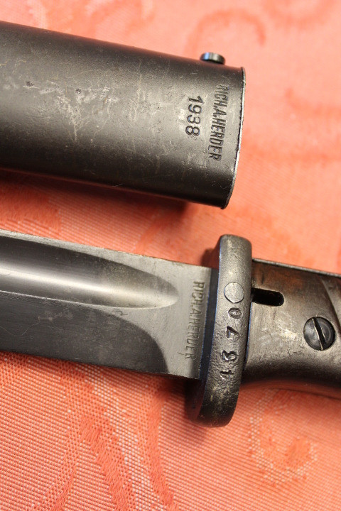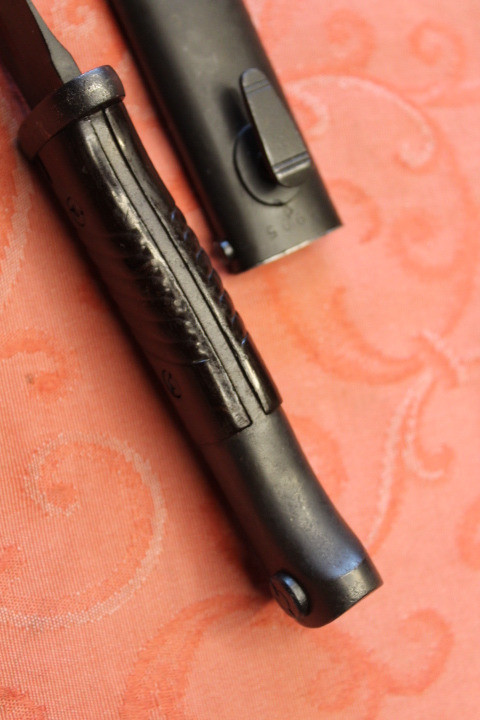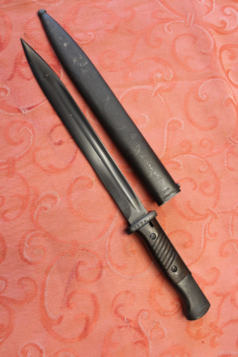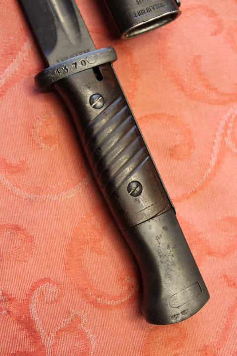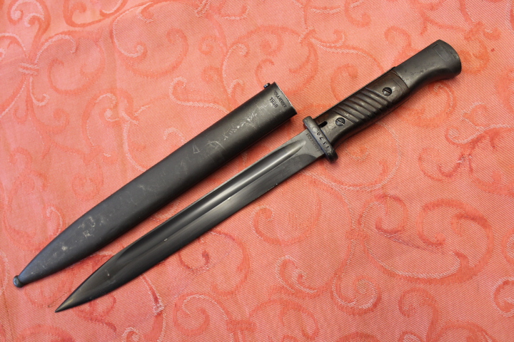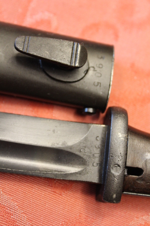 Im Fundzustand. Nicht für die Auktion irgendwie geschönt. Noch nicht Gereinigt. Der Drücker ist Leichtgängig . Komplett Original. Die Scheide und das Bajonett haben den selben Hersteller und Seriennummer. Zustand siehe die Bilder. Porto EU= 19,50€