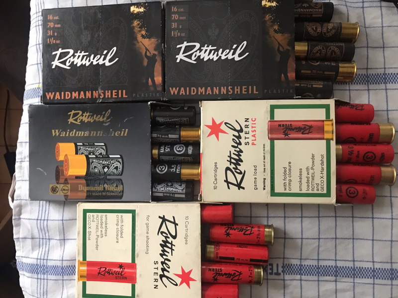 Von Privat aus einem Nachlass an EWB : 50 Schrotpatronen von Rottweil im Kaliber 16 : 20 Schuss Waidmannsheil Plastic in 3,2 mm 10 Schuss Waidmannsheil in 3,5mm - 10 Schuss Stern in 3,5mm und 10 Schuss Stern Pappe in 2,5mm - Teilweise mit Oxydationsspuren am Hülsenboden , siehe Bild - Fabrikpatronen - Von Privat, daher keine Garantie oder Rücknahme - Versandpauschale 6 Euro - Verkauf nach Österreich nach Rücksprache möglich -