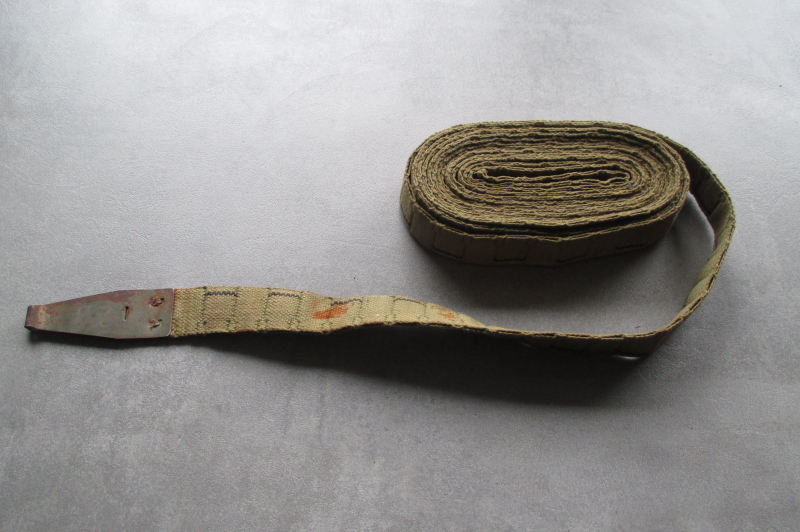 Biete hier aus Sammlungsauflösung einen schönen und originalen MG-Gurt aus Stoff für das US Maschinengewehr Browning M1919 A4 aus dem 2.WK in der Farbe grün an. Es handelt sich um einen Webgurt für 250 Schuss Cal. 30-06, der in einer Munitionskiste aus Blech eingelegt war. Stempel von 1943. Zustand gebraucht, leicht fleckig und etwas rostig an dem Einführstück, ein Einführstück fehlt, siehe Fotos.