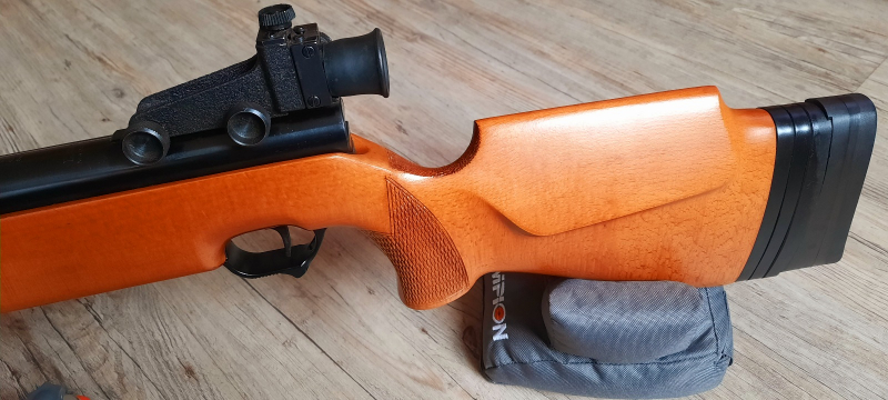 Es ist ein Dioptergewehr welches mit einem Seitenspannsystem ausgestattet ist. Die Schaftkappe ist in Höhesowie in Länge 30 mm verstellbar.