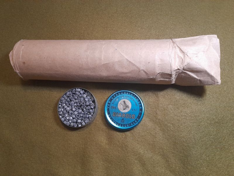 Zum Verkauf stehen 12 Dosen a 200 Stück VEB-Schönebeck Diabolo Kal. 4,5mm im original DDR Papier verpackt. Habe eine Dose fürs Foto entnommen und geöffnet damit der Zustand ersichtlich ist auf dem Bild, was auch Bestandteil der Beschreibung ist.