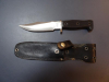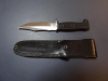 Die angedeutete Rückenschneide ist genau das: nur angedeutet. Der Hartgummigriff ist mit drei etwas martialisch anmutenden Hohlschrauben befestigt, in diesen Hohlschrauben ist ein wenig Rost zu sehen. Äußerlich ist alles rostfrei, mit ein paar oberflächlichen Schabspuren und nicht ganz fabrikfrisch, aber meines Erachtens sehr gut erhalten. Die Scheide aus dickem Leder hat allerhand kleine Druckstellen und die schwarze Oberfläche ist hie und da ab, sie macht aber insgesamt einen soliden Eindruck, weit davon entfernt gammelig zu wirken. Sie knarzt sogar noch wenn man sie drückt.