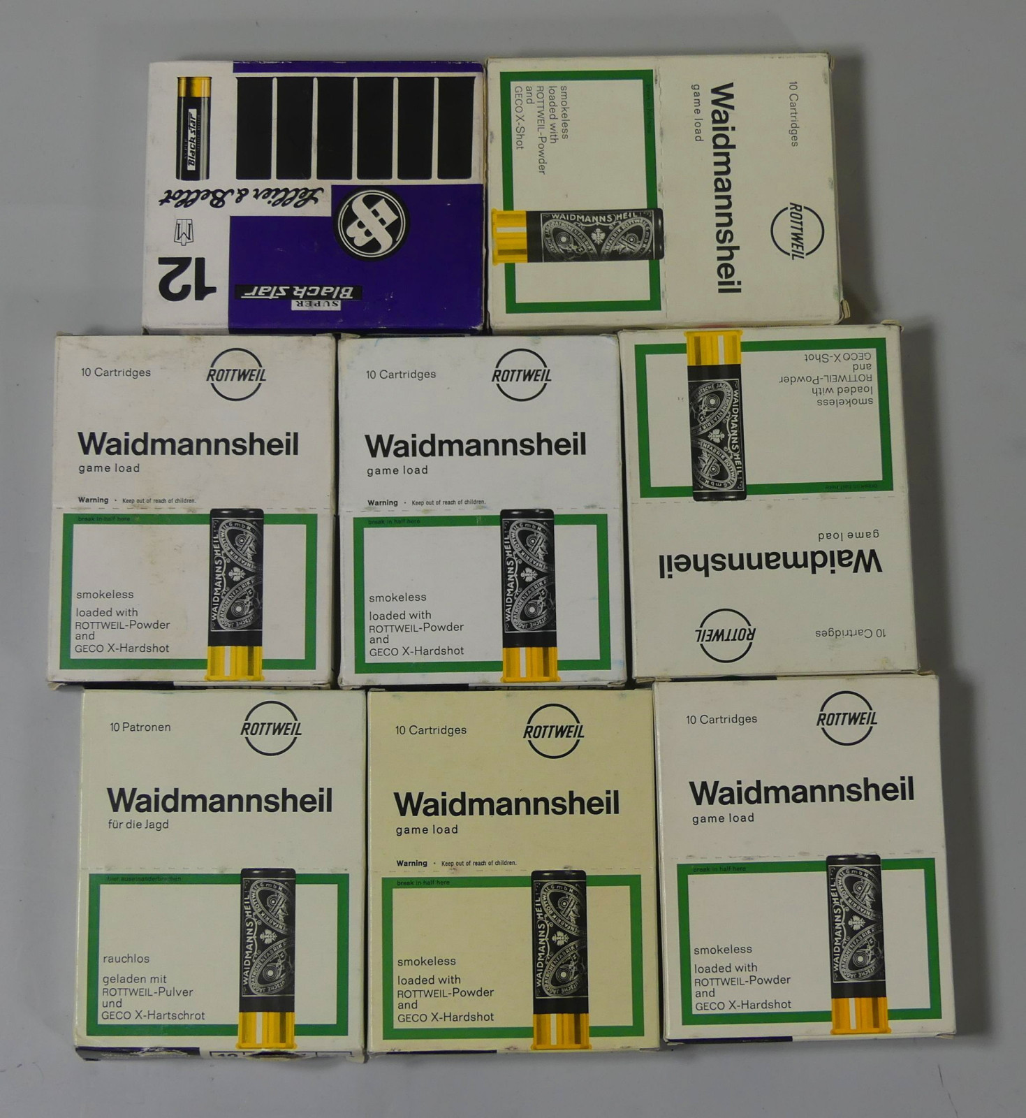 Wir bieten Ihnen hier im Kundenauftrag 70 Schuss Rottweil Waidmannsheil 12/70 mit 2,5 mm Körnung und 10 Sellier & Bellot Super Black Star 12/70 mit 3,5 mm Körnung - alles Bleischrot. Zum Sammeln oder Jagen.