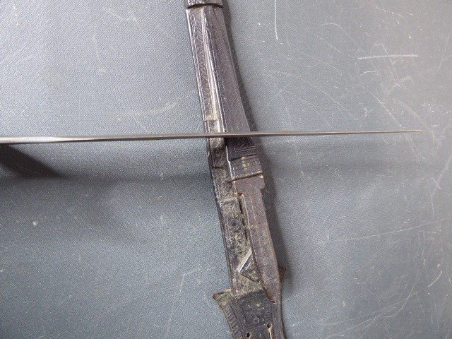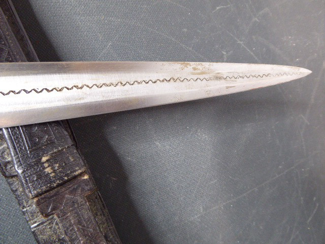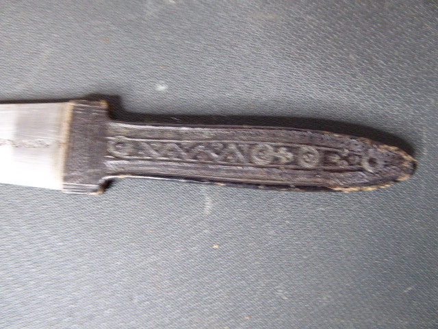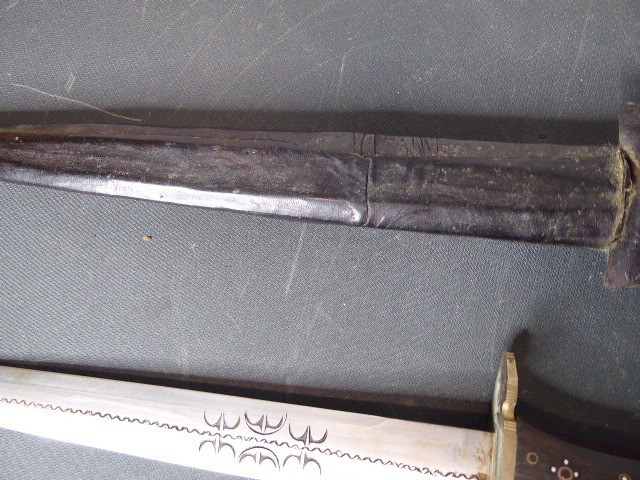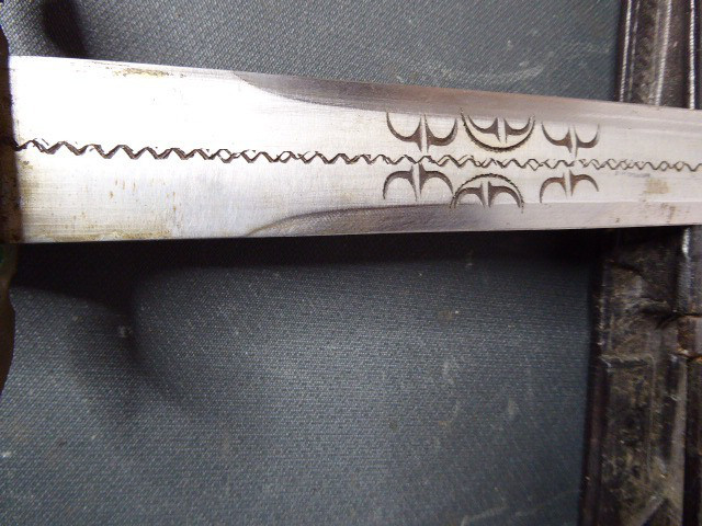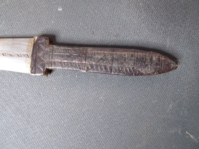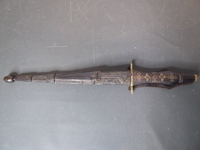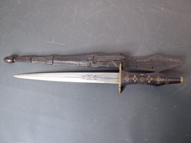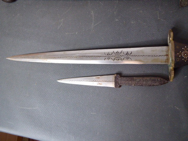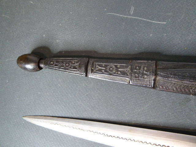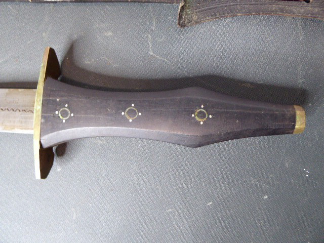 Aus meiner Sammlung gebe ich, ein älteres großes Asiatisches? Messer mit Scheide und Beimesser ab. Kenner werden es sicherlich wissen wo das Teil getragen wurde. Griff Ebenholz mit Silbernen und Messing Ornamenten verziert, Parierung und Knauf aus Messing. Klinge zweischneidig, beidseitig mit Eisenschnitt Verzierungen. Beimesser Klinge auch mit Eisenschnitt Verzierungen. Scheide Holz mit Geprägten Leder ummantelt und Trageschlaufe. Das Teil ist im Guten Sammelwürdigen Zustand. Alles andere entnehmen Sie Bitte den Fotos. Gesamtlänge: 50 cm, ohne Scheide: 45,5 cm, Klingenlänge: 30 cm, Klingenbreite: 2,8 cm. Kann zu jederzeit bei mir besichtigt werden. Privatauktion keine Rücknahme und Garantie.