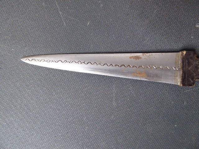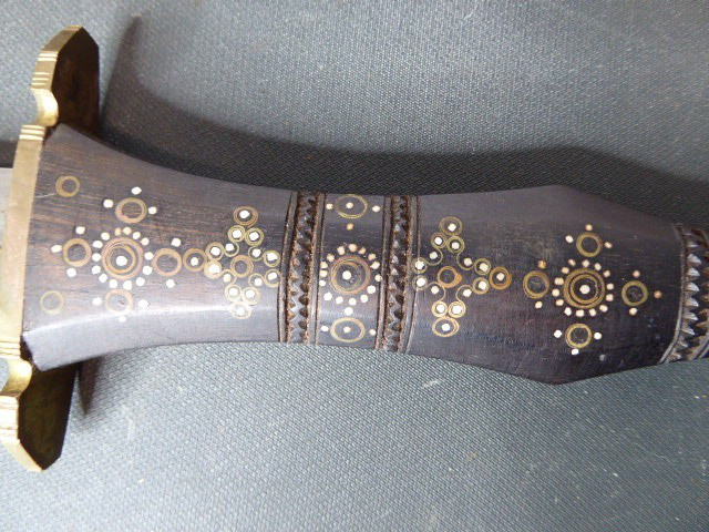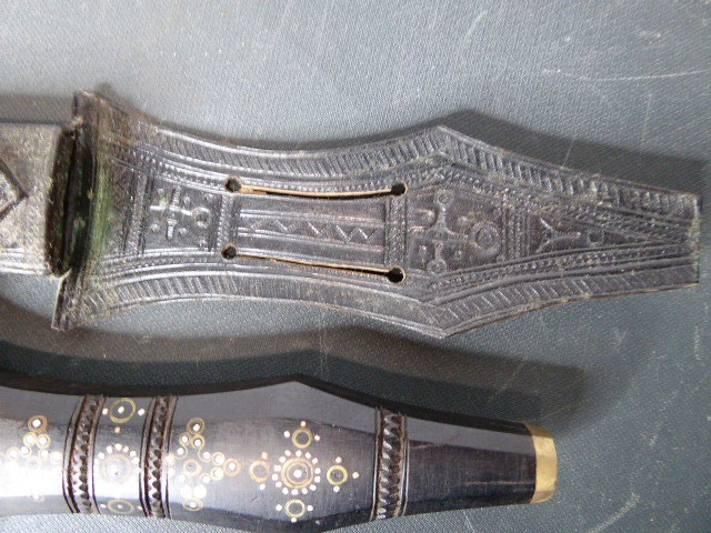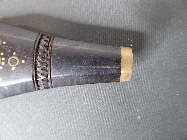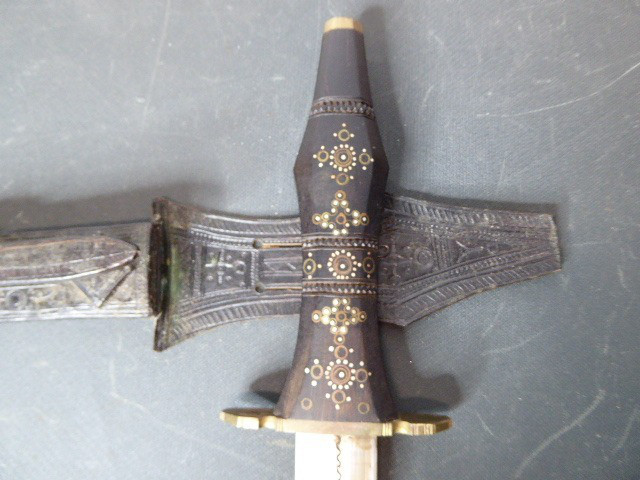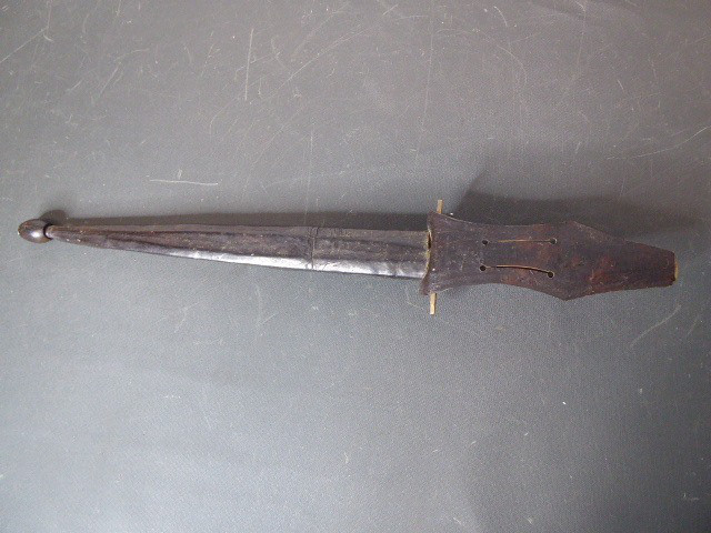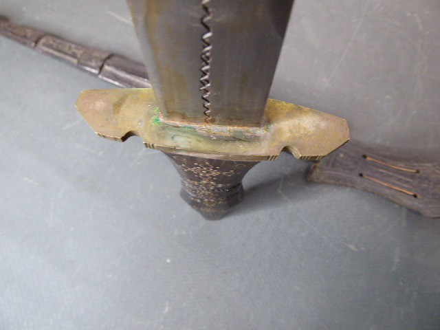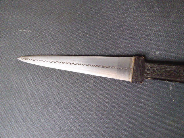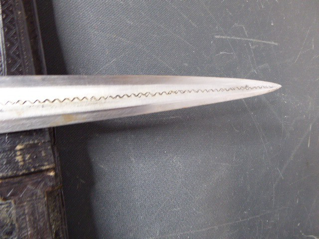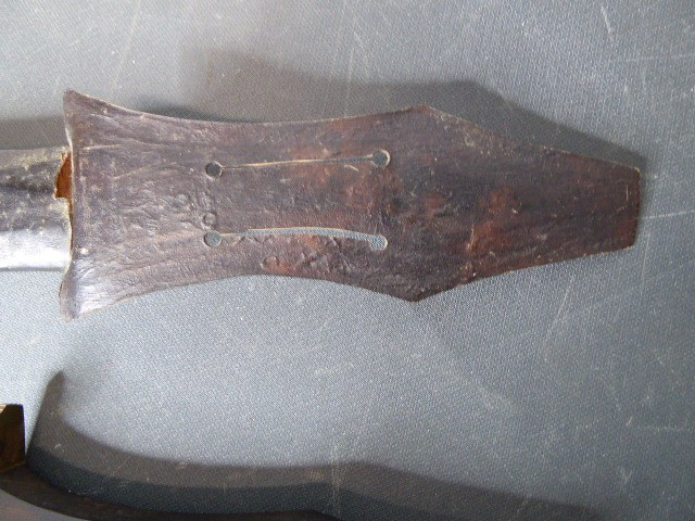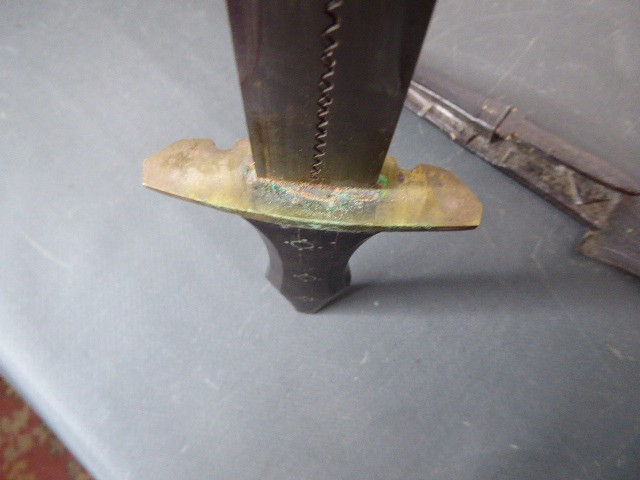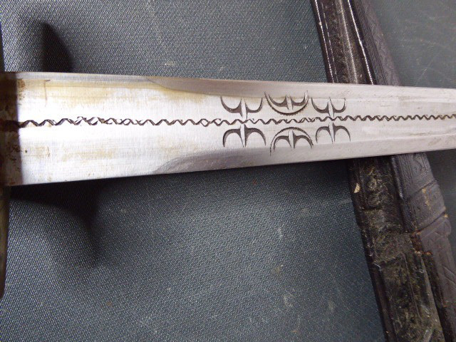 Aus meiner Sammlung gebe ich, ein älteres großes Asiatisches? Messer mit Scheide und Beimesser ab. Kenner werden es sicherlich wissen wo das Teil getragen wurde. Griff Ebenholz mit Silbernen und Messing Ornamenten verziert, Parierung und Knauf aus Messing. Klinge zweischneidig, beidseitig mit Eisenschnitt Verzierungen. Beimesser Klinge auch mit Eisenschnitt Verzierungen. Scheide Holz mit Geprägten Leder ummantelt und Trageschlaufe. Das Teil ist im Guten Sammelwürdigen Zustand. Alles andere entnehmen Sie Bitte den Fotos. Gesamtlänge: 50 cm, ohne Scheide: 45,5 cm, Klingenlänge: 30 cm, Klingenbreite: 2,8 cm. Kann zu jederzeit bei mir besichtigt werden. Privatauktion keine Rücknahme und Garantie.