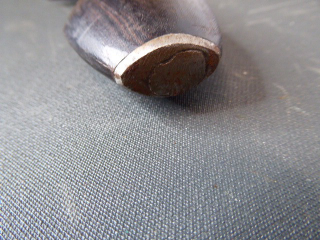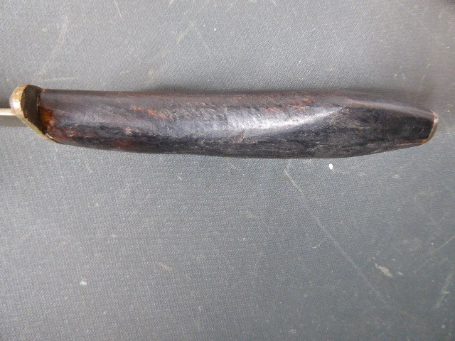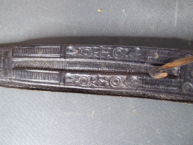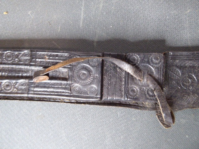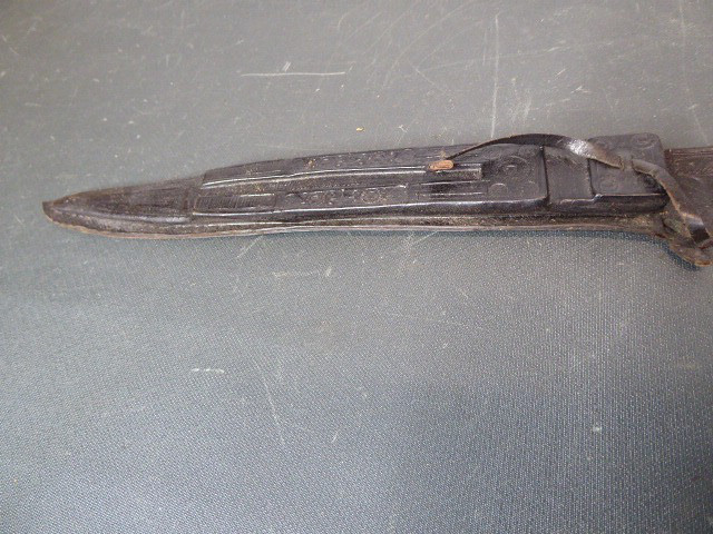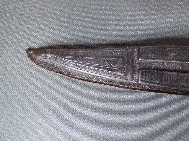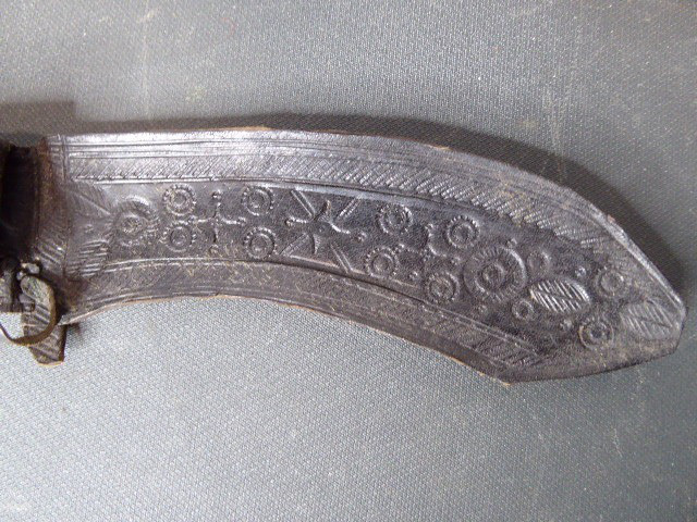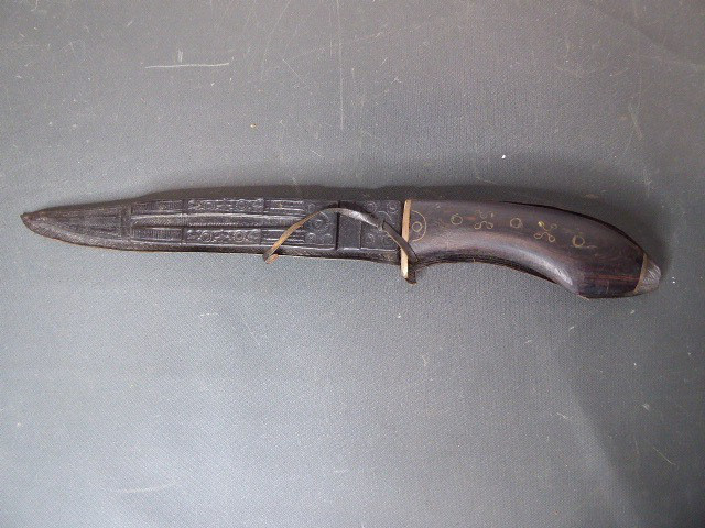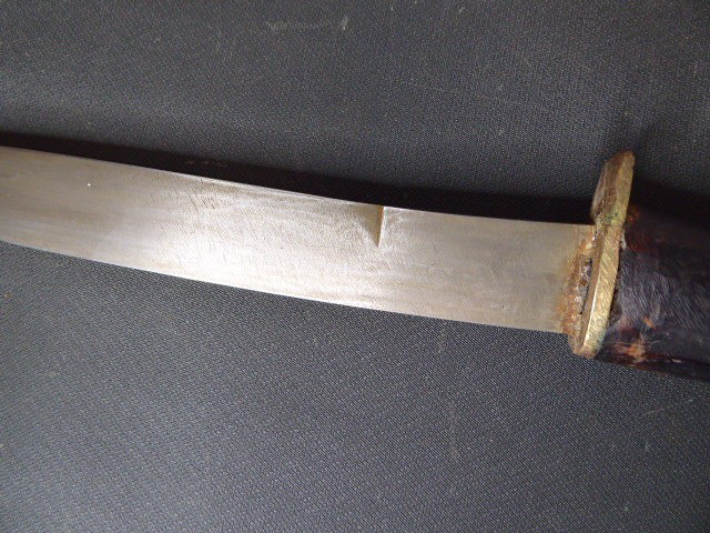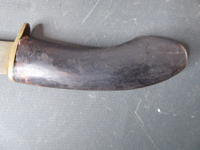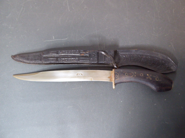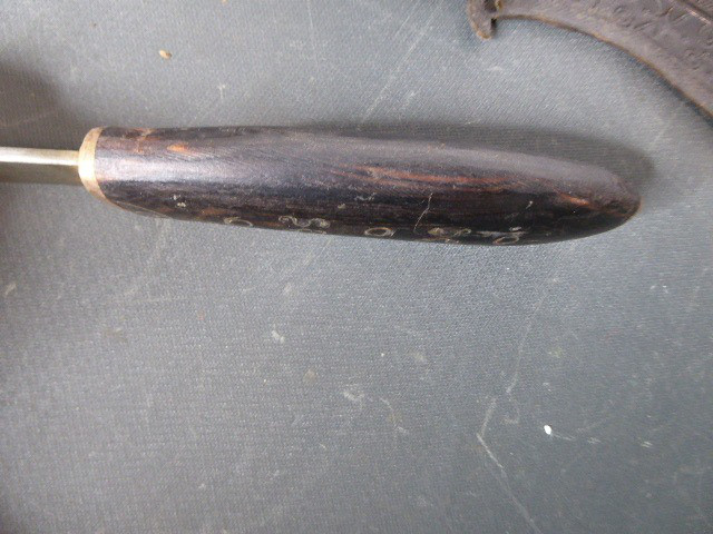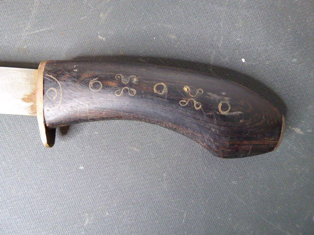 Aus meiner Sammlung gebe ich, ein älteres großes Asiatisches? Messer mit Scheide ab. Kenner werden es sicherlich wissen wo das Teil getragen wurde. Griff Ebenholz? mit Messing Ornamenten verziert. Einschneidige Klinge mit Punzen. Scheide Holz mit Geprägten Leder ummantelt und Trageschlaufe. Das Teil ist im Guten Sammelwürdigen Zustand. Alles andere entnehmen Sie Bitte den Fotos. Gesamtlänge: 40 cm, ohne Scheide: 38,5 cm, Klingenlänge: 25,3 cm, Klingenbreite: 2,6 cm. Kann zu jederzeit bei mir besichtigt werden. Privatauktion keine Rücknahme und Garantie.