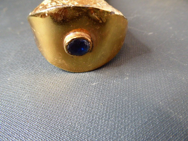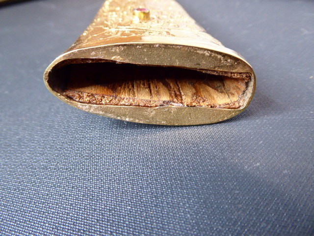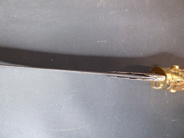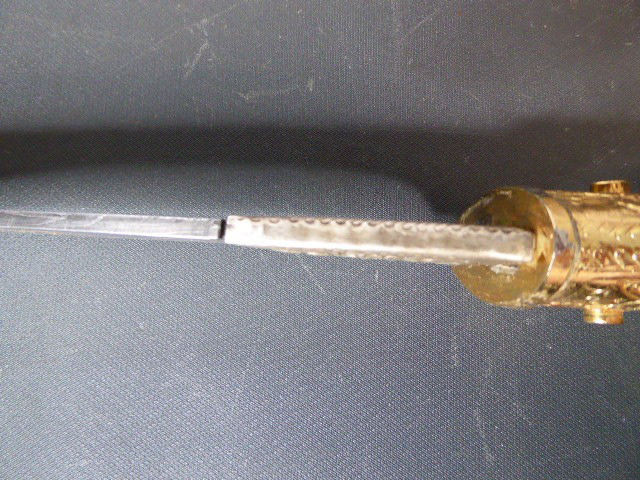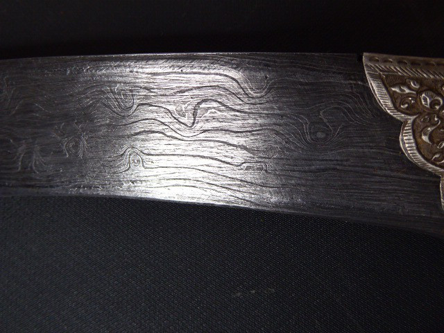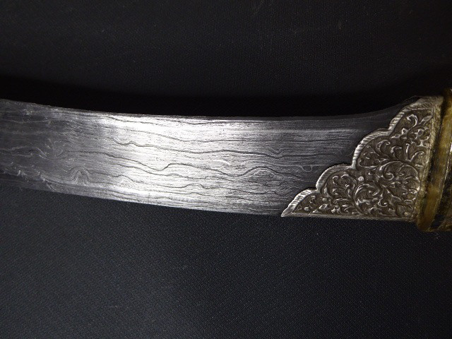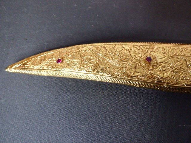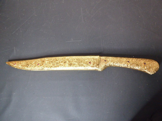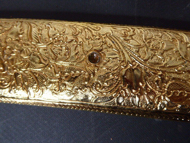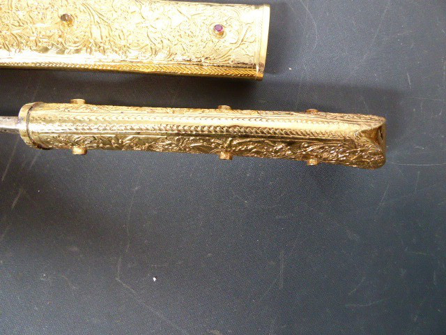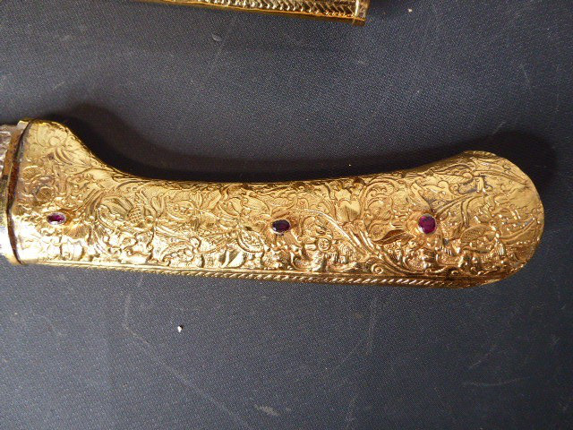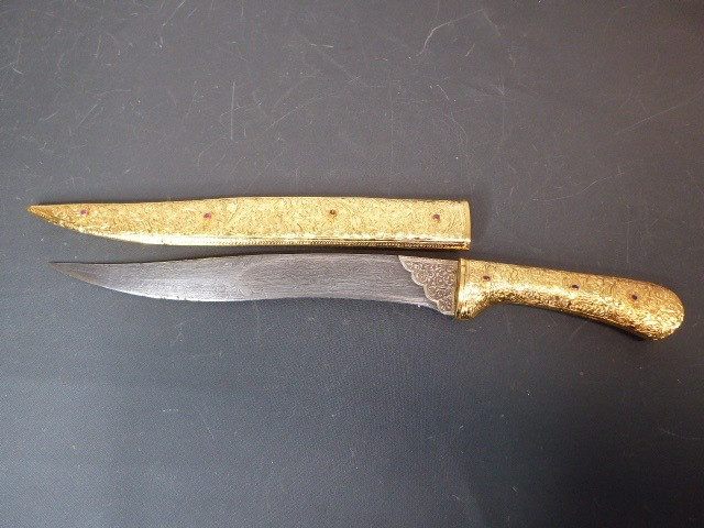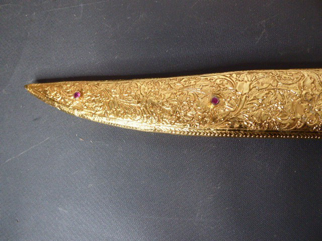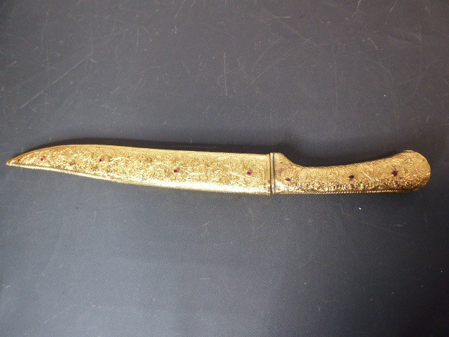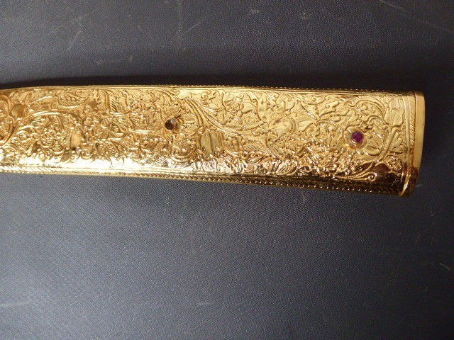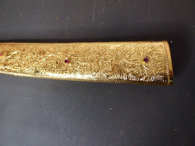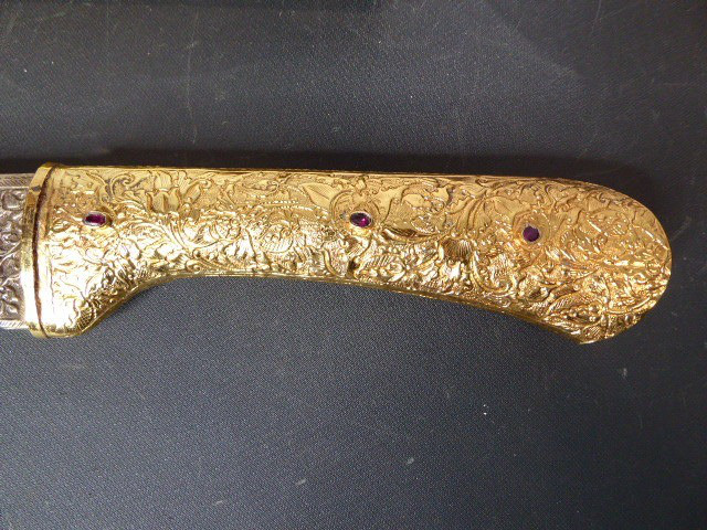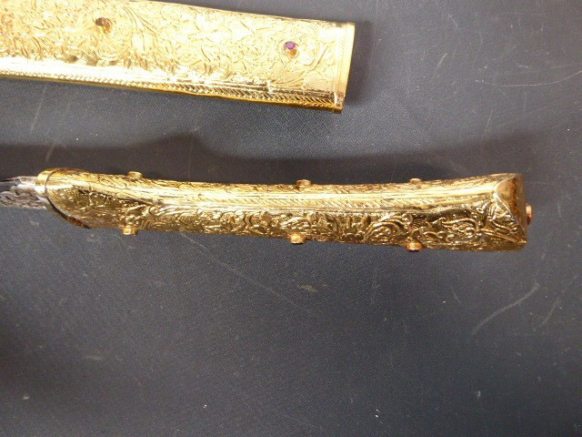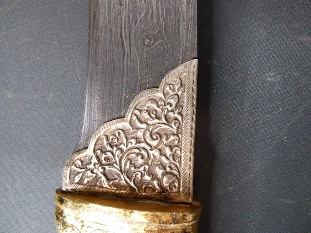 Aus meiner Sammlung gebe ich, ein älteren sehr großen Asiatisch? Dolch Damast Klinge mit Vergoldeten Griff und Scheide ab. Kenner werden es sicherlich wissen wo das Teil getragen wurde. Sehr Großer Griff mit Floralem Ornamentierten stark Vergoldeten Blech/ Silber? nicht geprüft, ummantelt, noch beidseitig jeweils beidseitig 3 gefaste rote Steine. Knauf mit einem großen gefasten blauen Stein verziert. Breite Einschneidige Stabile Damast Klinge, am Griff mit ornamentierten Silberblech gefast. Scheide Holz mit Floralem Ornamentierten stark Vergoldeten Silberblech ? nicht geprüft ummantelt, beidseitig noch je 4 gefasten roten Steinen aufgesetzt, es fehlt aber einer. Das Teil ist im Sammelwürdigen Zustand. Alles andere entnehmen Sie Bitte den Fotos. Gesamtlänge: 57 cm, ohne Scheide: 53 cm, Klingenlänge: 34 cm, Klingenbreite: 4,5 cm. Kann zu jederzeit bei mir besichtigt werden. Privatauktion keine Rücknahme und Garantie.