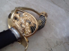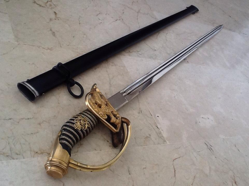 Vergoldeter Messinggriff. Dreiarmiger Handschutz mit preußischem Adler. Kurzschwänziger Knauf. Holzgriff mit silbergefeiltem Rochenlederbezug und vergoldetem Messingmonogramm Wilhelms II. Gerade, gekehlte Klinge, 80,6 cm lang. Die Klinge ist am Ricasso signiert (Coppel Alexander ALCOSO Solingen). Schwarz lackierte Stahlscheide. Der Handschutz zeigt einen preußischen Adler, Kaiser Wilhelm II. Zeit des Zweiten Reiches. Säbel dieser Art mit preußischem Adler im Handschutz sind im Originalzustand sehr selten; die Verzierungen sind oft abgerissen oder beschädigt. Dieser Säbel wurde auch im Ersten Weltkrieg verwendet. Der 1898 gefertigte Säbel befindet sich in sehr gutem Zustand. Der Griff ist vergoldet. Die Klinge ist in sehr gutem Zustand. Die Scheide ist in gutem Zustand und wurde restauriert.Weitere Produkte von mir finden Sie auf meiner Website (oldgun.fr). Folgen Sie mir auch auf Instagram.