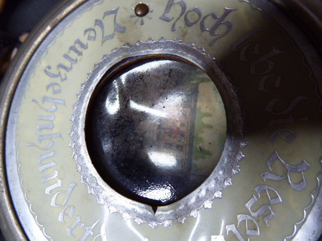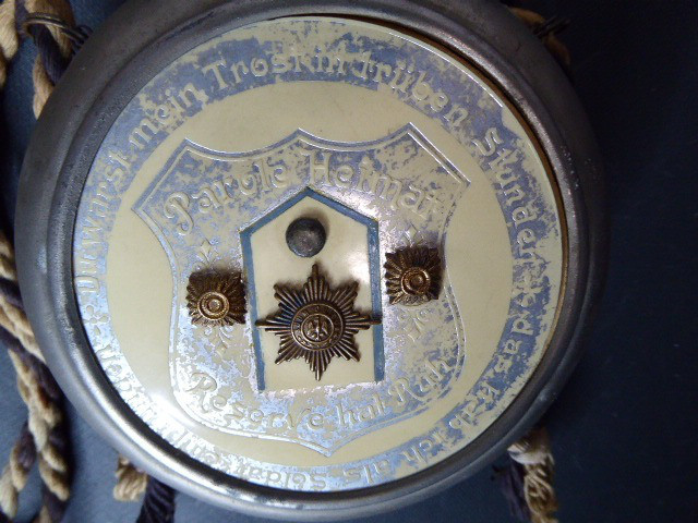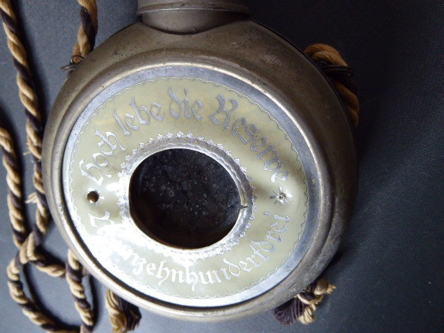 Alte Reservisten Flasche von 1903 aus Glas mit Blech ummantelt innen mit Bild