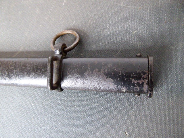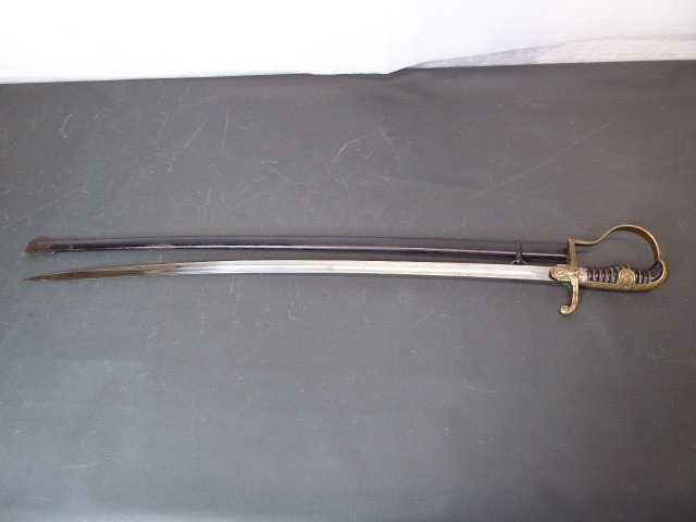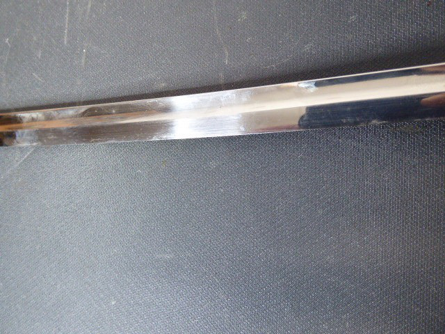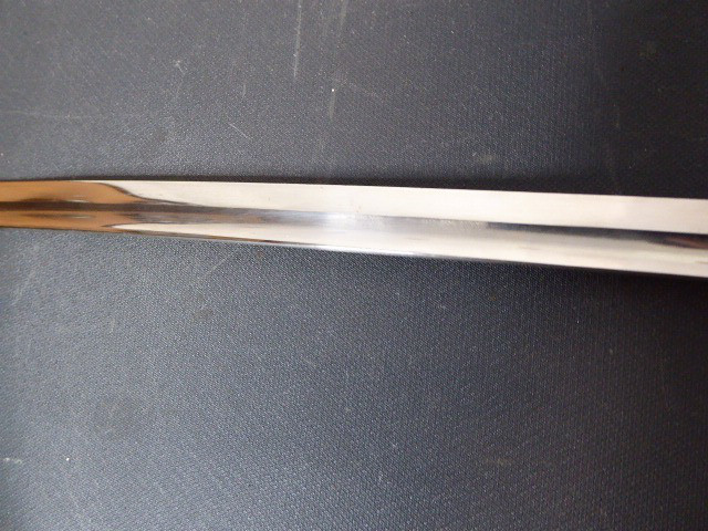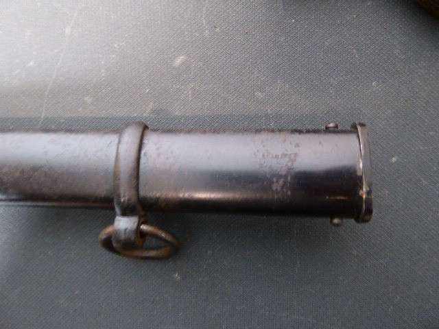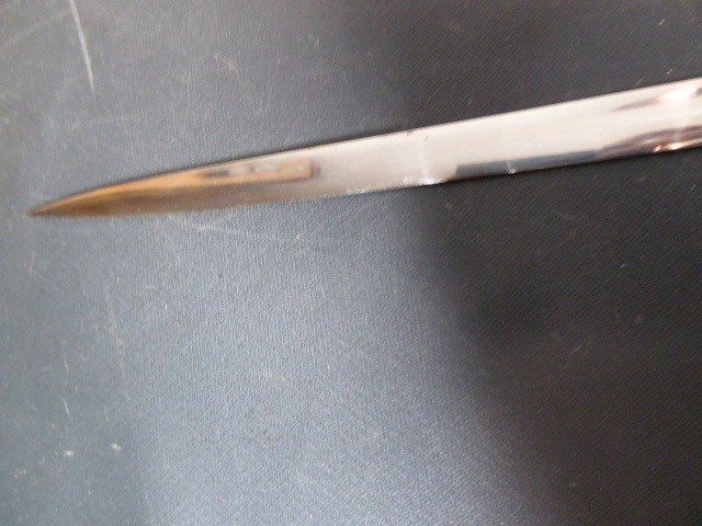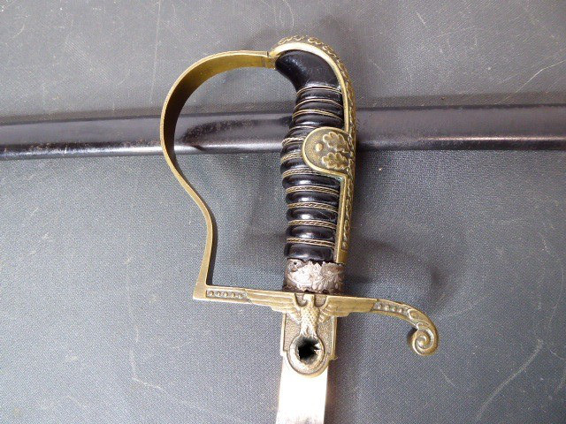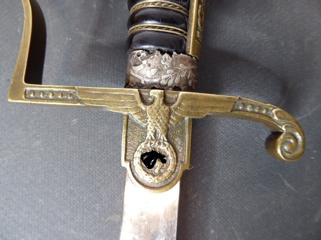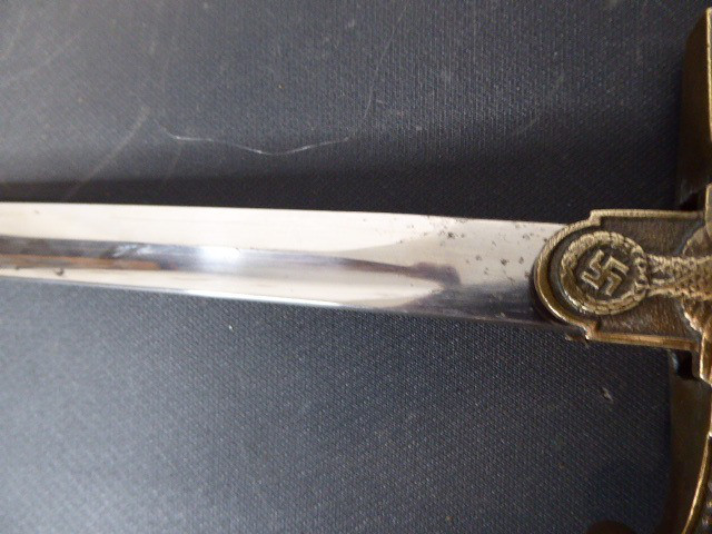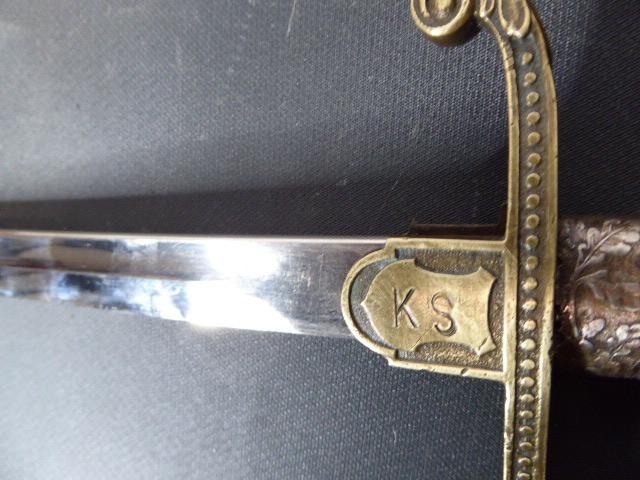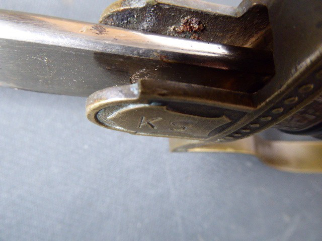 Aus meiner Sammlung gebe ich, ein alten seltenen 3. Reich Säbel frühe Ausführung Hersteller geprägtem TIGER und Scheide ab. Griff Holz mit Bakelit ummantelt Bakelit im Oberen Bereich mit Abplatzungen und Riss mit dreifacher Drahtwicklung. Gefäß aus Messing, vorne auf dem Grifflappen Großer Adler, hinten auf dem Grifflappen Initialen KS. Griffzwinge schon etwas Zerschlissen. Einschneidige Klinge auf der Fehlschärfe gepunzter Tiger. Stahlscheide mit Original Lack. Das Teil ist im Sammelwürdigen Zustand. Alles andere entnehmen Sie Bitte den Fotos. Gesamtlänge: 90 cm, ohne Scheide: 87,5 cm, Klingenlänge: 75,3 cm, Klingenbreite: 2 cm. Kann zu jederzeit bei mir besichtigt werden. Privatauktion keine Rücknahme und Garantie.