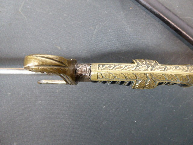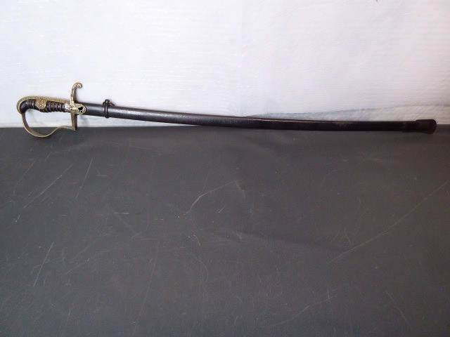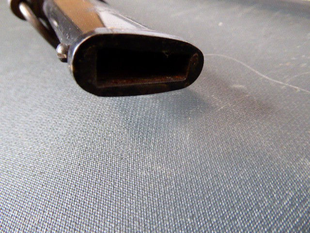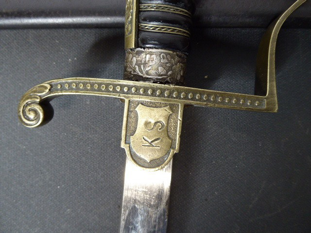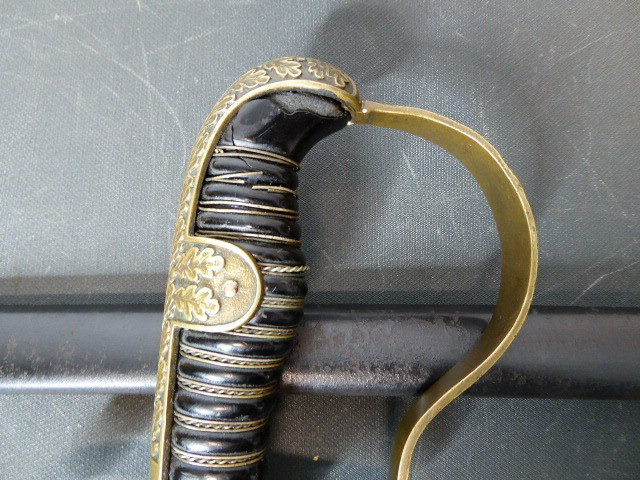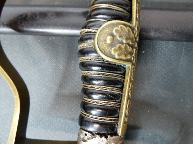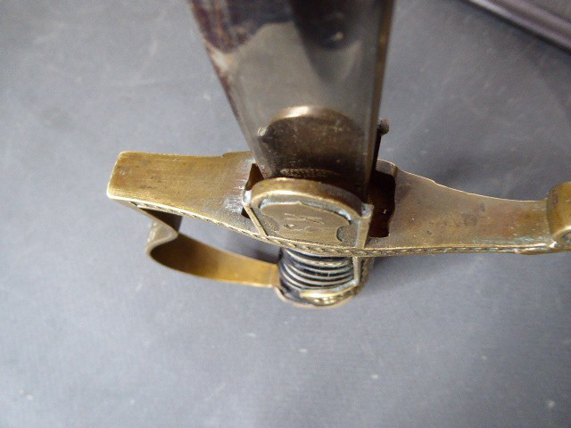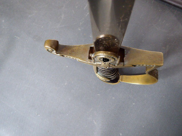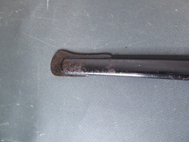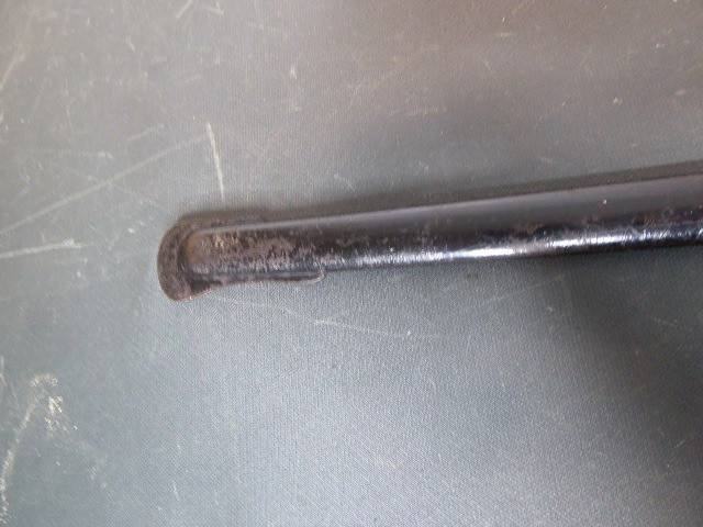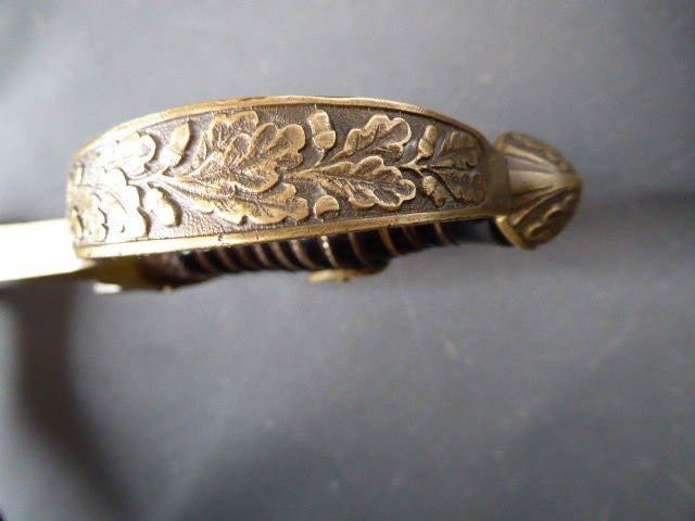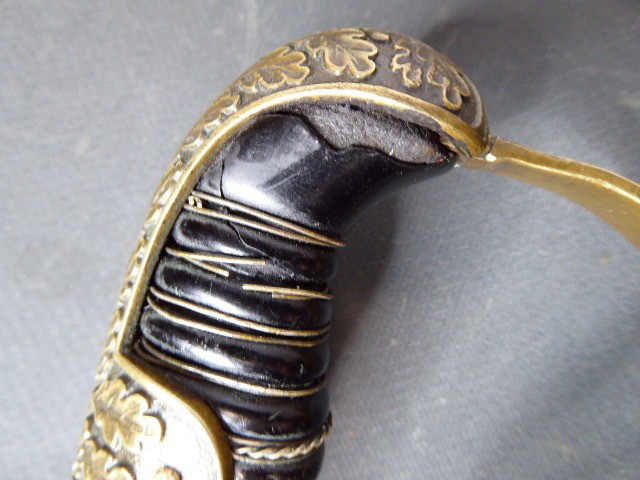 Aus meiner Sammlung gebe ich, ein alten seltenen 3. Reich Säbel frühe Ausführung Hersteller geprägtem TIGER und Scheide ab. Griff Holz mit Bakelit ummantelt Bakelit im Oberen Bereich mit Abplatzungen und Riss mit dreifacher Drahtwicklung. Gefäß aus Messing, vorne auf dem Grifflappen Großer Adler, hinten auf dem Grifflappen Initialen KS. Griffzwinge schon etwas Zerschlissen. Einschneidige Klinge auf der Fehlschärfe gepunzter Tiger. Stahlscheide mit Original Lack. Das Teil ist im Sammelwürdigen Zustand. Alles andere entnehmen Sie Bitte den Fotos. Gesamtlänge: 90 cm, ohne Scheide: 87,5 cm, Klingenlänge: 75,3 cm, Klingenbreite: 2 cm. Kann zu jederzeit bei mir besichtigt werden. Privatauktion keine Rücknahme und Garantie.