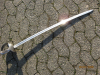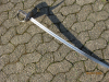 87 cm lange Rückenklinge, beidseitig gekehlt, symmetrischer Korb mit sechs Löchern, schwarz beledertes Griffholz, Stahlscheide mit Mundstück, Schleifeisen, schräg gestellte Klammer, beweglicher Tragring, gut erhalten, Auf der Vorderund Hinterseite der Scheide eine Delle , siehe Bilder